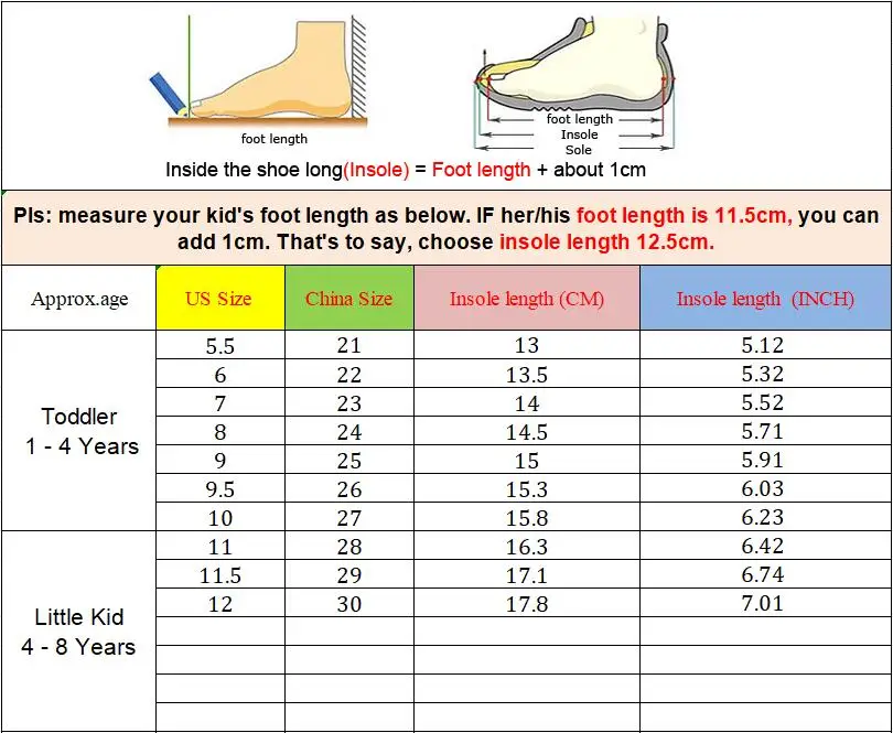 5. Что касается размера, Измерьте длину стопы ребенка в см или дюймах + 1 см или 0,03937 дюймаChВыберите соответствующий американский размер, спасибо