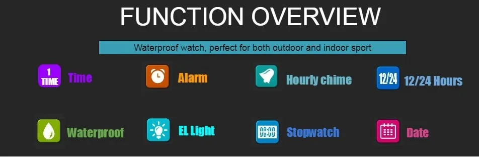 С двумя часовыми поясами Дисплей Цифровой: часы, минуты, секунды, pm, месяц, дата, день 12/24 формата отображения времени Функция будильника и ежечасного звонка Специальный дизайн с хронографом (секундомером) с шагом 0,01 секунд