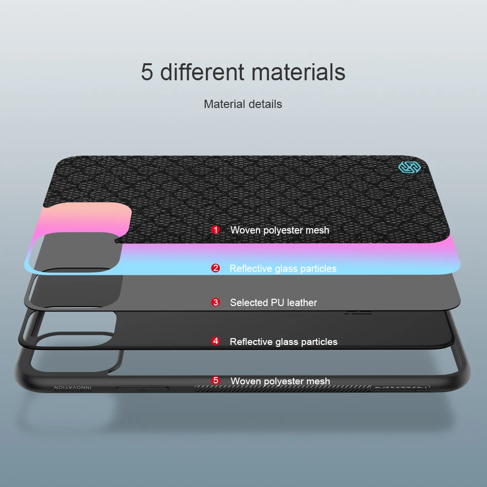 Чехол Twinkle изготовлен из 5 различных материалов. Оправа является экологически безопасной и гибкой из ТПУ, задняя крышка из поликарбоната. Комбинация твердости и мягкости. Легко наносится и снимается. Изготовлен из искусственной кожи высокого качества, соединен со светоотражающими стеклянными частицами. Поверхность-тканая полиэфирная сетка. Процесс изготовления отражающих стеклянных частиц делает его мерцающим под другой светильник.