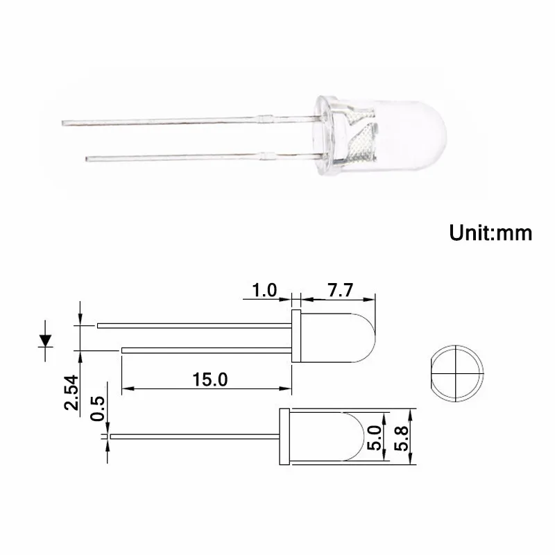 Полярность: анод (более длинная часть) | Катод (более короткая часть)