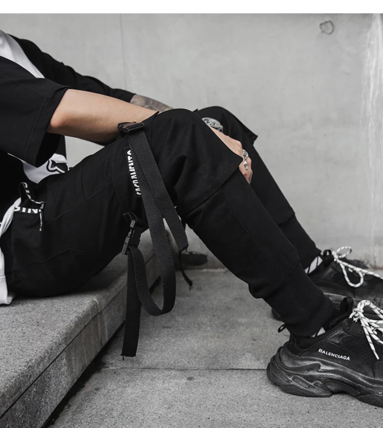 Мужские брюки-шаровары в стиле хип-хоп, черные спортивные штаны с несколькими карманами и лентами, уличные повседневные мужские брюки, M-2XL, весна 2019