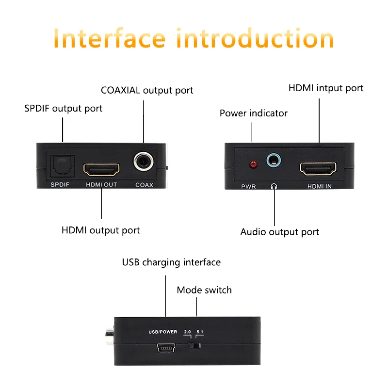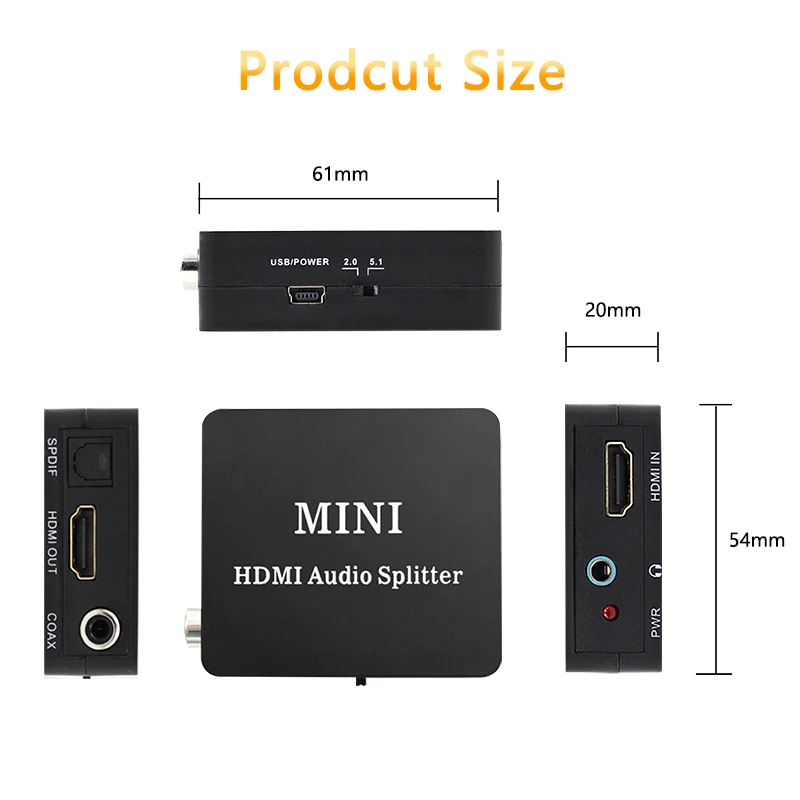 ---- Выходной порт: 1 * HDMI , 1 * SPDIF,1 * коаксиальный, 1*3,5 мм наушники ---- HDMI вход/выход разрешение: 480i/480p/576i/576p/720p/1080i/1080p ---- Аудио режим: 2,0/5,1 ---- HDMI аудио адаптер: SPDIF, коаксиальный и 3,5 мм аудио наушников ---- Поддержка выход отдельно к усилителю или динамик или 3,5 мм разъем для наушников без подключения ТВ/монитора.---- Светодиодный индикатор: когда источник связи работает, светодиодный светильник;