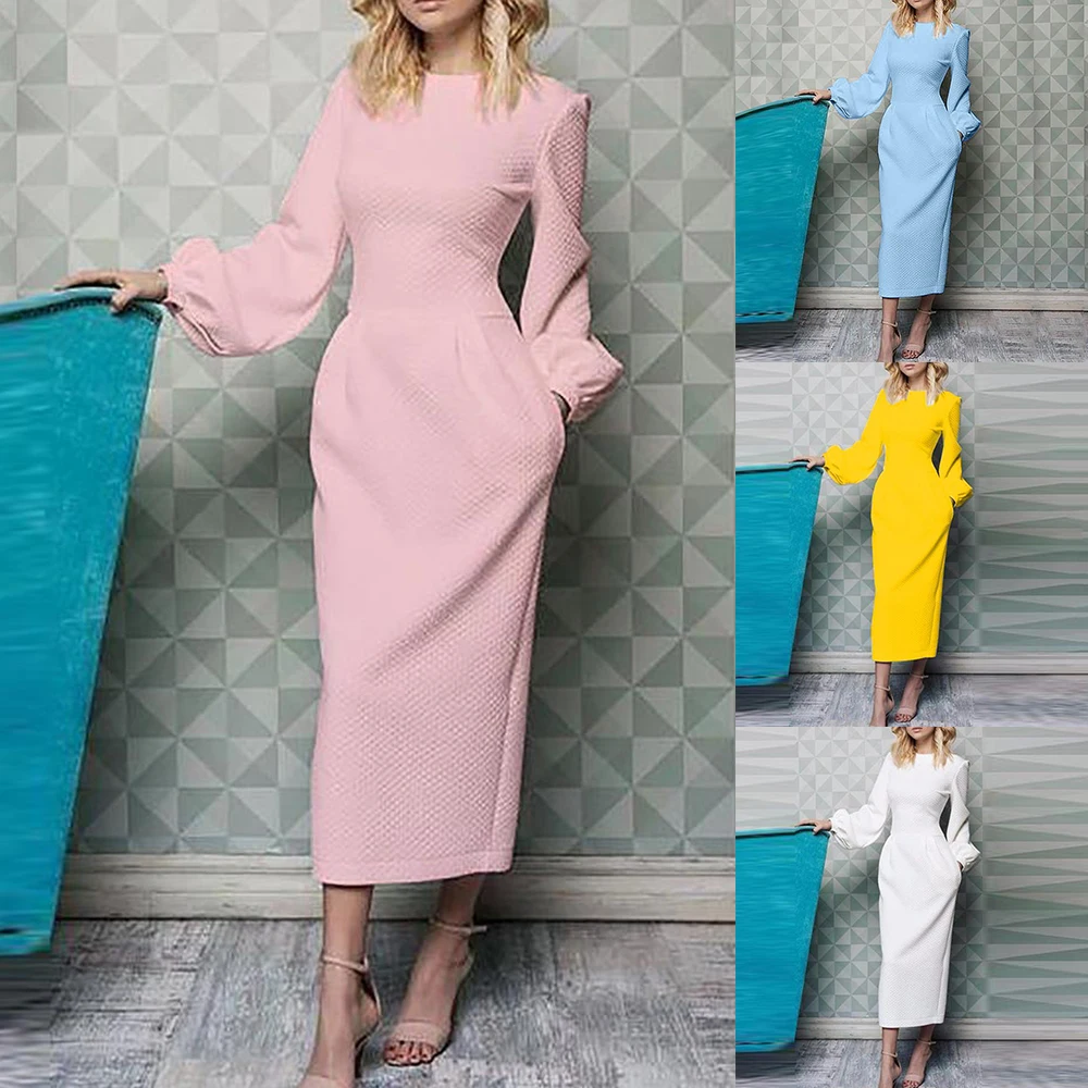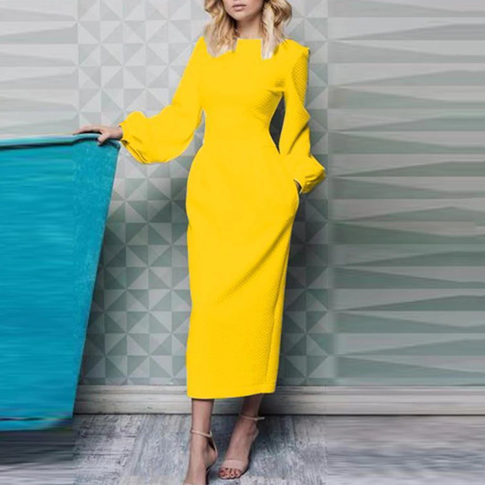 Женское офисное платье с длинным рукавом, повседневное приталенное платье с карманами, длинное платье-туника, лето 2019