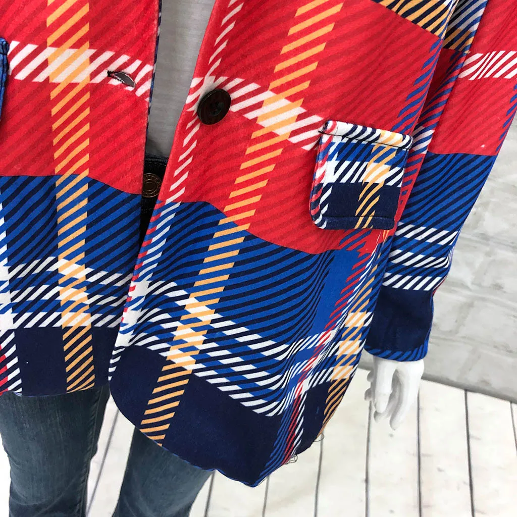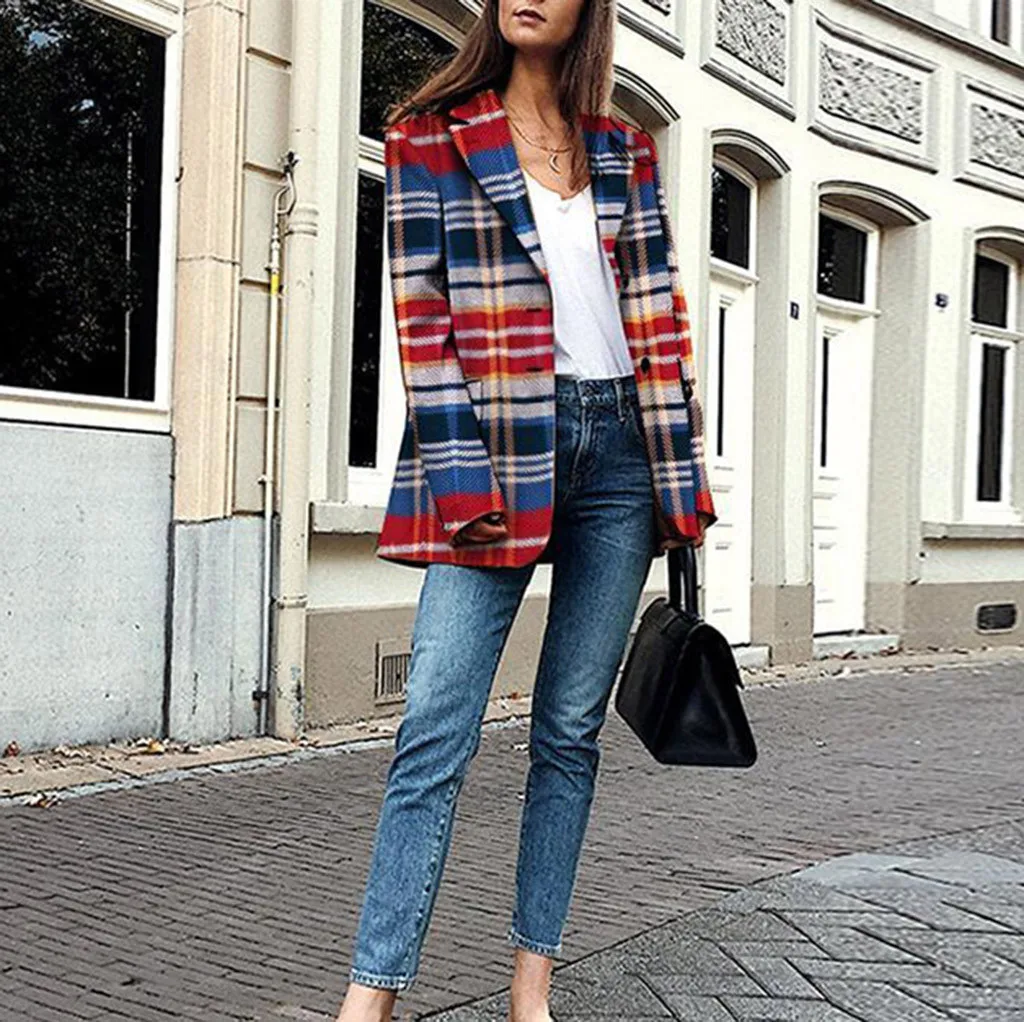 Женский приталенный Блейзер в клетку с двумя карманами и длинным