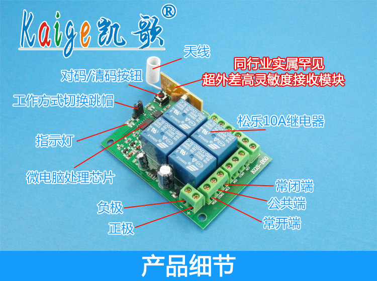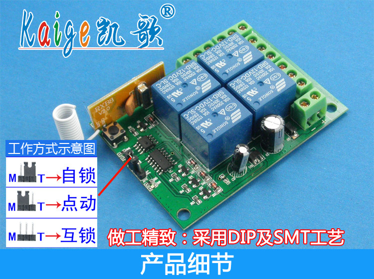 Особенности: 1>. Дальние расстояния 4000 метров: используется высокочастотная трехуровневая трубка усиления сигнала, которая находится дальше от дистанционного управления 3000 метров на рынке. 4000 метров-это Теоретическое расстояние. Общее расстояние дистанционного управления на открытом воздухе составляет от 1000 до 3000 м (окружающая среда отличается, расстояние также отличается, фактическое использование зависит от размера воздействия на окружающую среду), И расстояние будет сокращено в случае препятствий. 2>. Высокая чувствительность: Получение сигнала принимает реальный Супергетеродинный модуль RXB8, чувствительность-114dBm, чувствительность и способность анти-помех находятся далеко за пределами супер-регенерации на поверхности супермаркета и обычного супер-гетеродинного модуля, расстояние дистанционного управления все более и более стабильное. 3>. Высокая мощность: Ningbo Songle 10А реле для обеспечения долгосрочного стабильного контроля мощных электроприборов. 4>. Режим работы свободно регулируется пользователем: пользователь может изменить режимы самоблокировки, блокировки и пробежки. 5>. Код типа обучения: вы можете узнать код 4 ключа дистанционного управления с той же частотой. (Не беспокойтесь, если вы потеряете пульт дистанционного управления во время процесса. Просто купите пульт дистанционного управления и изучите его. Все в порядке, нет необходимости заменять его, это экономит много. Стоимость пользователя).