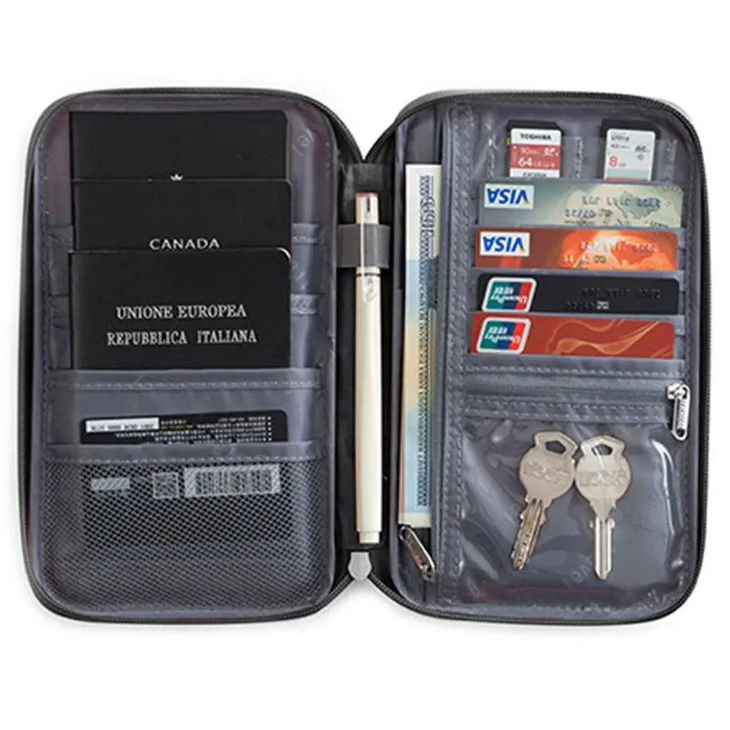 С слотами для авиа-билета, кредитных карт, удостоверений личности, монет и банкнот.