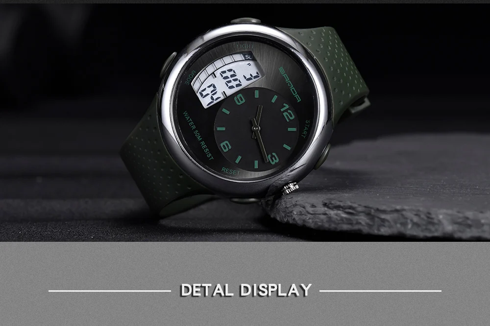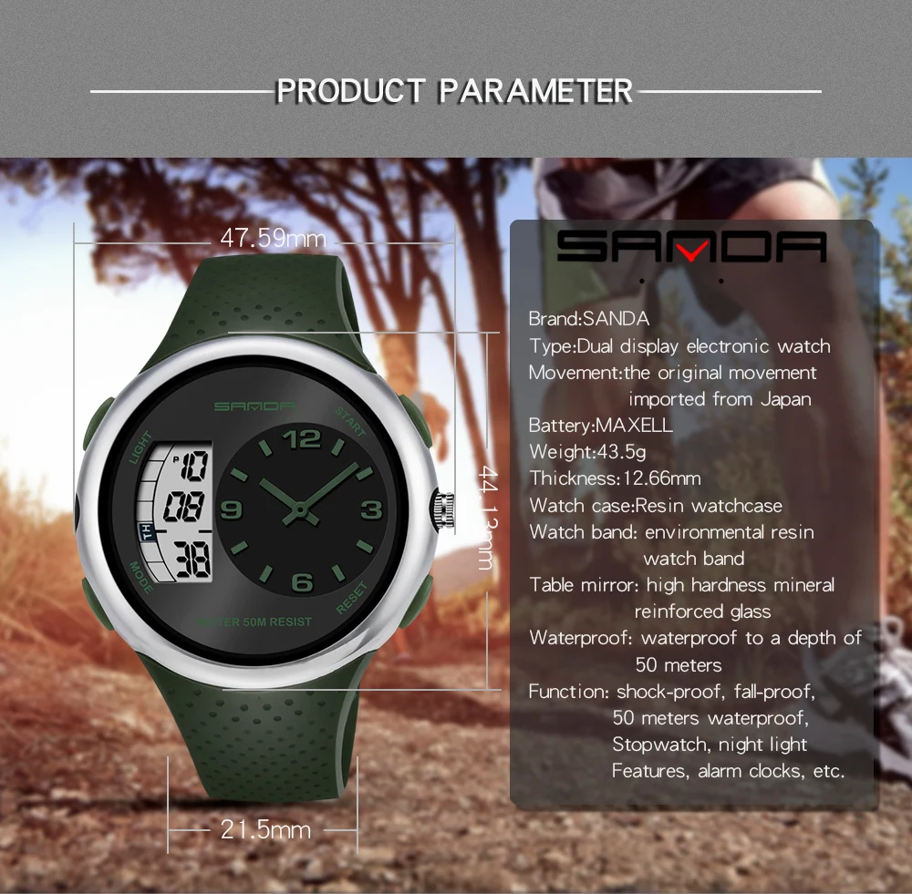 Бренд: Sanda Модель: 763 Специальные функции: Ночной светильник, сигнализация, календарь, 24-часовой индикацией, отображение дня недели, отображение месяца Тип дисплея: указатель Применимые люди: мужчины Стиль: Повседневный Водонепроницаемость: 50 м Тип механизма: кварцевый Происхождение движения: Япония Модель движения: Оригинальный механизм Марка движения: Япония Диаметр циферблата: 44 мм Толщина: 12,5 мм Тип короны: плоская конусная Корона Тип нижней части стола: нормальный Материал зеркала: минеральное укрепленное стеклянное зеркало Стиль застежки: Пряжка Материал пряжки: нержавеющая сталь Материал ремешка: смола Форма циферблата: круглая Чехол Материал: смола Цвет: черный, серебристый, черный, черный, золотой, черный, синий, армейский зеленый, черный, красный