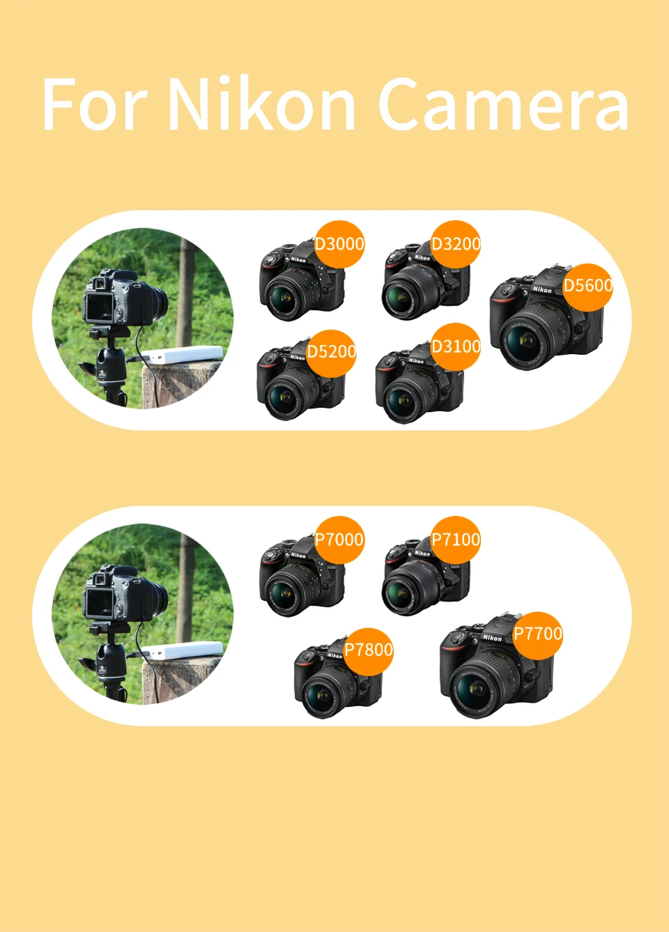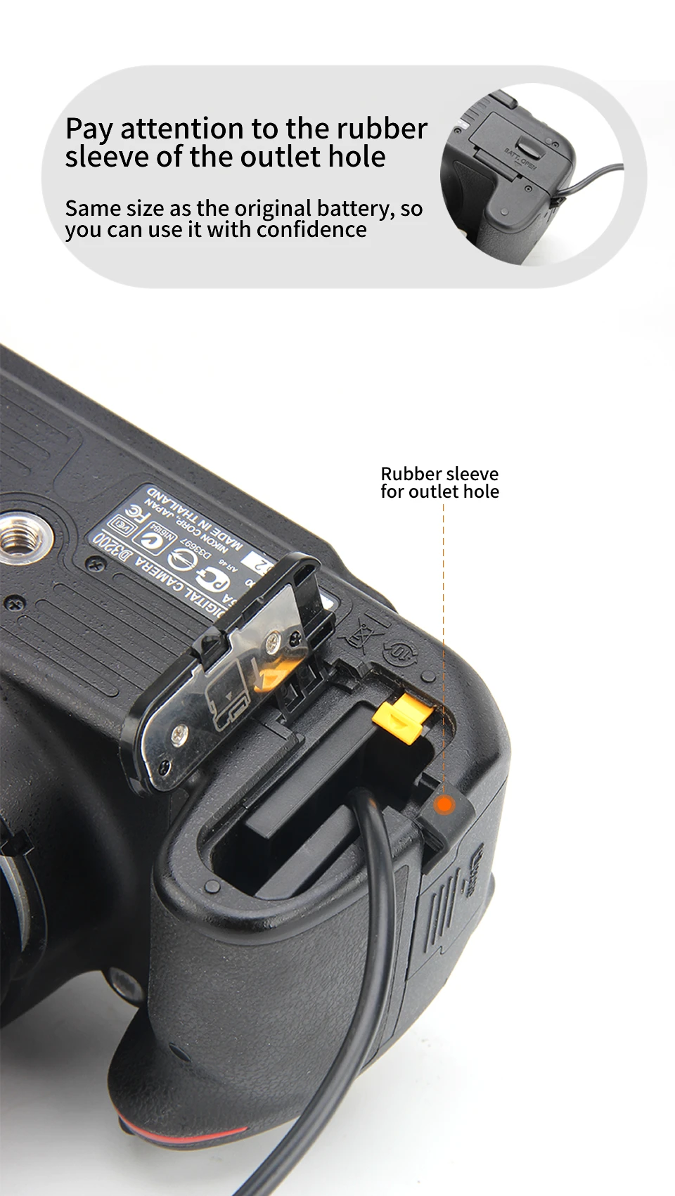 Важно! Обратите внимание, что закрытие крышки аккумулятора является необходимым шагом в использовании комплекта адаптера переменного тока. С небольшим зазором через держатель батареи, Откройте Резиновый зазор, позвольте шнуру питания пройти через зазор, а затем закройте крышку аккумулятора, затем вы можете подключить устройство к питанию и питанию. Когда цифровая камера много работает или хочет продлить срок службы EN-EL14 батареи, особенно если у вас нет внешнего источника питания, используйте наш набор usb-адаптеров. Этот набор функций адаптера постоянного тока работает с усилителем питания 5 В постоянного тока 8 В. Мобильный источник питания 5V 2A-4A теперь очень популярен и прост в обращении. С правильной линией мобильной портативности, он может обеспечить достаточную мощность для цифровых камер в течение длительного периода времени. Прямо сейчас, идеальное высококачественное и недорогое решение, DC-adapter kit BP-5A и заменить EN-EL14 батареи Внимание: 1. Чтобы оптимизировать работу камеры, используйте высококачественную мобильную мощность, Мобильная мощность требует 5 вольт 2A / 4A выходной ток. Когда мощность или ток недостаточны, вы не можете снимать. Пожалуйста, выберите по крайней мере лучший ток. 2. Мобильная мощность имеет автоматический режим подвески и выключена. 3. Не используйте USB компьютера, потому что выходное напряжение компьютера USB 2,0 в основном 5 В, но ток менее 500 мА. 4. Некоторые мобильный телефон/планшет USB зарядное устройство и сопротивление распознавания, я не знаю камеру, ток не может удовлетворить требования, поэтому не рекомендуется. 5. Используйте камеру в течение длительного времени, чтобы установить время ожидания камеры для максимального времени ожидания. Особенности: Вход: 5 V-2A-4A Выход: 8,4 V Спецификация разъема USB: USB2. 0 Длина:> 180 см Аксессуары: 1 USB кабель, 1 EN-EL14 чехол для аккумулятора Обратите внимание, что для камер Nikon требуется больше выходной мощности, постоянный ток 2.4A-4A, в зависимости от вашей конкретной модели камеры, обычно это управление от камеры кнопки. Применение EH-5 разъем адаптера или "флеш-накопитель USB кабель 5 V-8,4 с v-образной горловиной и с EP-5A соединитель постоянного тока. Совместимость с: Для NIKON D3100 Для NIKON D3200 Для NIKON D3300 Для NIKON D3400 Для NIKON D5100 Для NIKON D5200 Для NIKON D5300 Для NIKON D5500 Для NIKON D5600 Для NIKON P7000 Для NIKON P7100 Для NIKON P7700 Для NIKON P7800