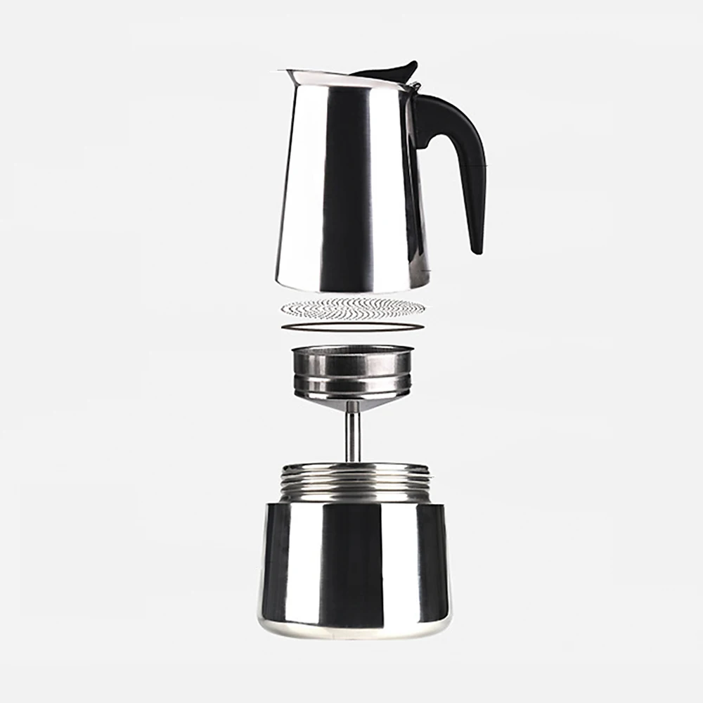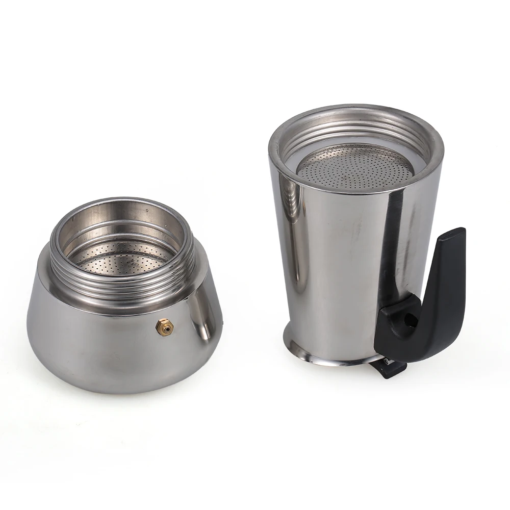 Три отделения легко соединяются с помощью завинчивания. Эта Кофеварка изготовлена из нержавеющей стали с пластиковой ручкой, которая удобно лежит в руке. Это может сделать процесс производства легким и приятным. Удлиненное основание делает горшок стабильно стоящим.
