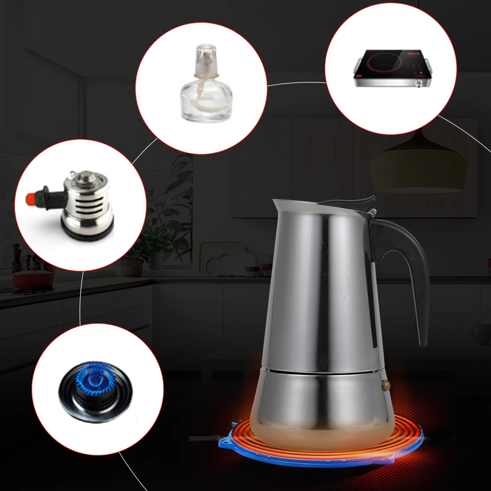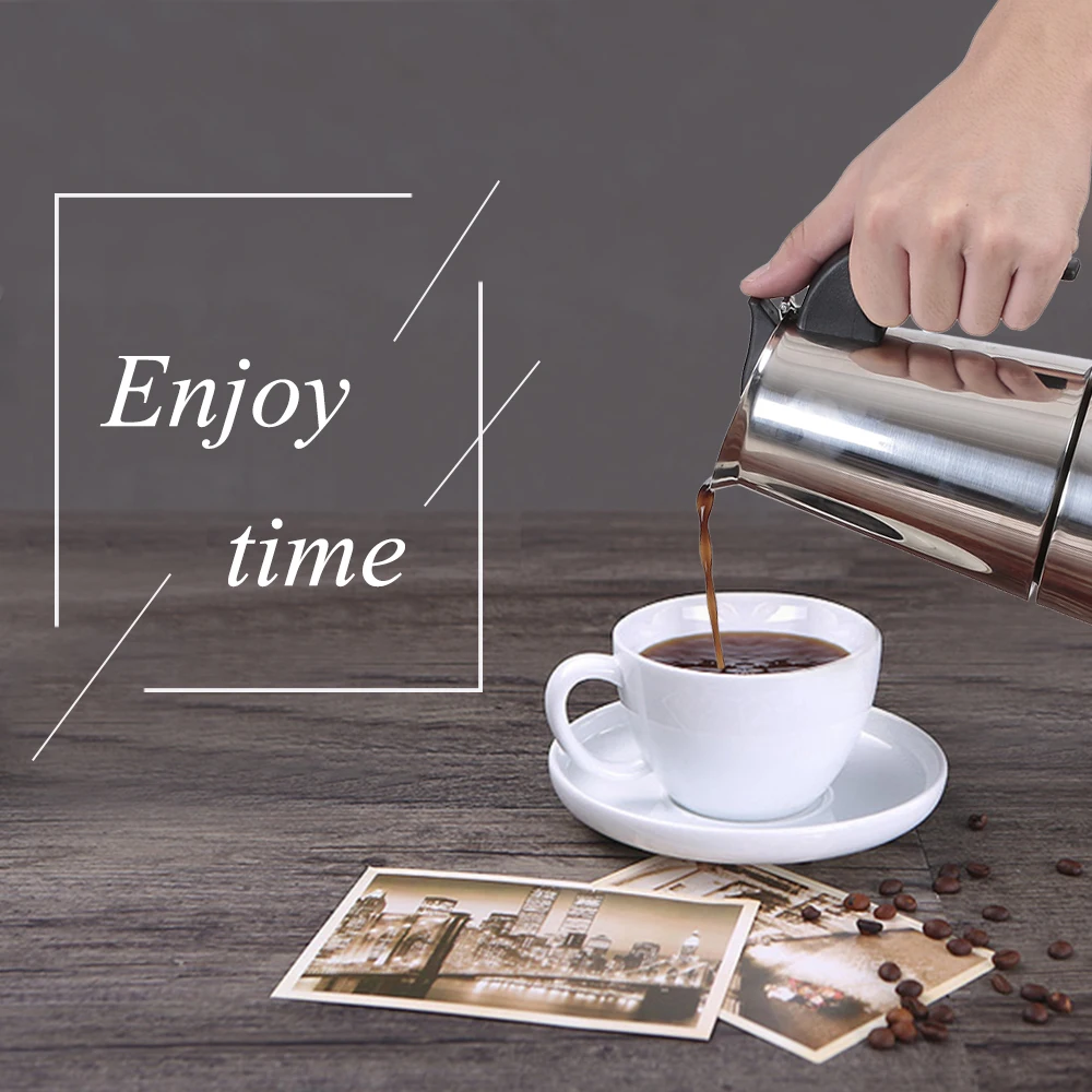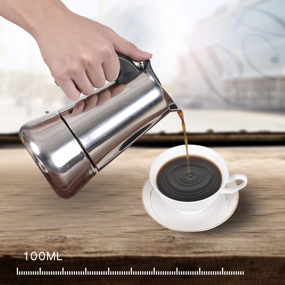 Сделано для любителей эспрессо: плита из нержавеющей стали для эспрессо была сделана для тех, кто не может противостоять полнотелым ароматным чашкам эспрессо. Сделать идеальный эспрессо не так просто, как сделать чашку кофе, но это легко с итальянской Эспрессо-машиной. Ароматизируя молотые бобы при заполнении кофейника эспрессо, вы почувствуете аппетит к полной ароматизированной чашке Эспрессо. Помните, что мы заботимся, мы производим 2-9 ароматных Эспрессо-чашек.