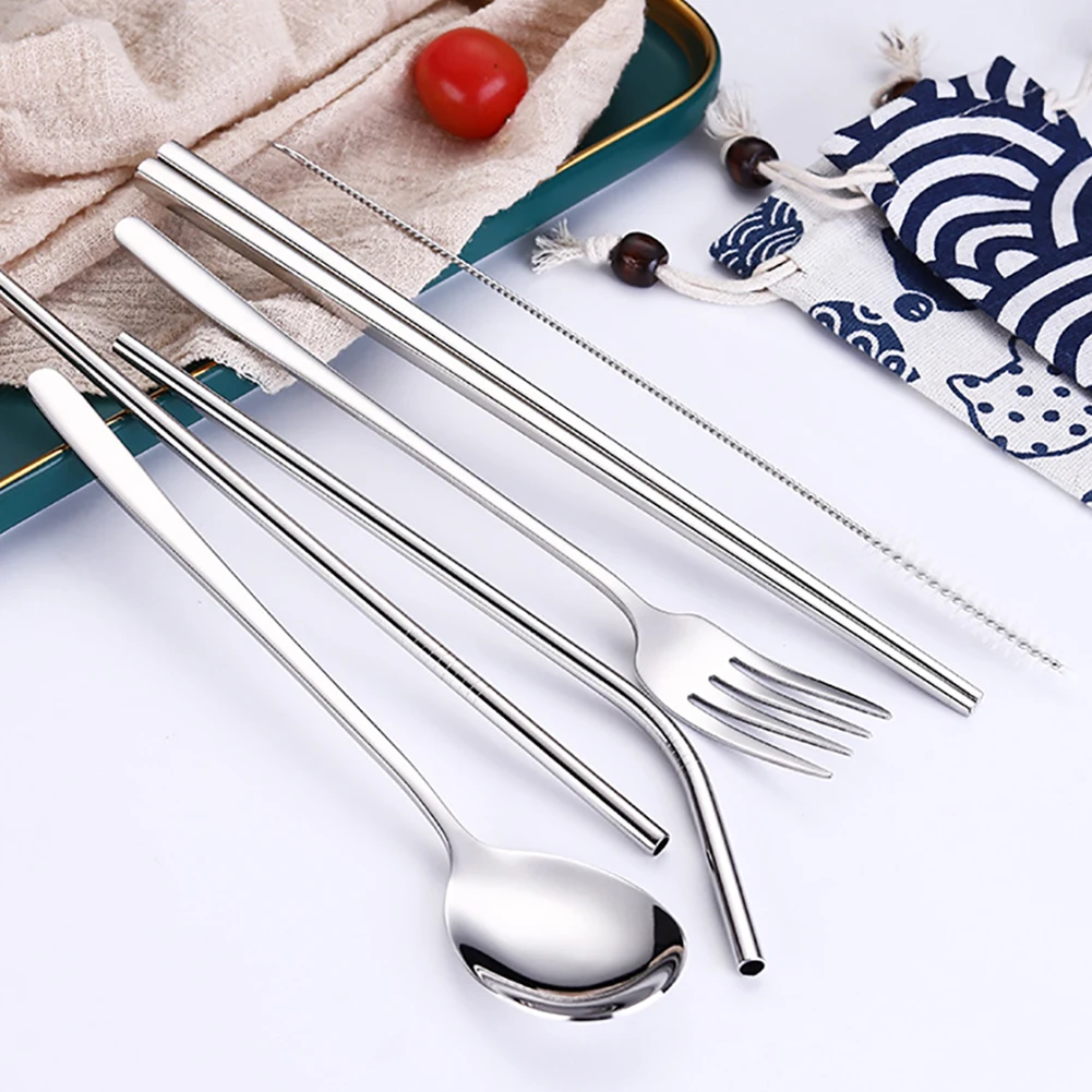 Набор посуды, включающий палочки для еды, ложку, вилку, соломинку, портативный и удобный для переноски.