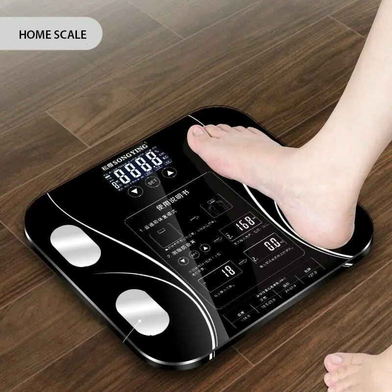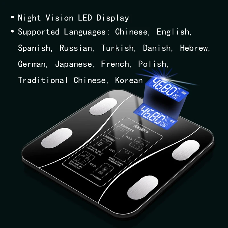 <15 Функции измерения состава тела: с технологией анализа Биоэлектрического сопротивления (BIA), цифровая шкала не только показывает вес тела, но и показывает жир, воду, мышечную масса, ИМТ и другие данные. Это поможет вам точно узнать больше данных о вашем теле вовремя.