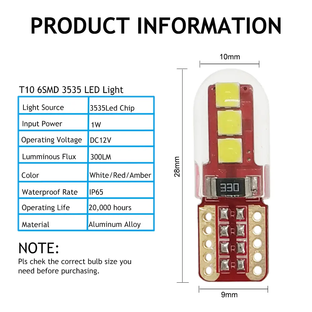 Особенности: Тип розетки: T10 194 W5W 168 501 .... Тип чипа светодиодный лампы: 3535 светодиодный чип Светодиодный чип Q'ty для автомобилей: 6 чипов Цвет: белый/красный/желтый Мощность: 2 Вт Напряжение: 12 В постоянного тока Световой поток: 300LM Водонепроницаемый: IP65. Срок службы: 30000 часов Для номерного знака светильник, светильник для чтения, купольный светильник, карта светильник, дневной ходовой светильник s, зазорный светильник и т. Д. Применение: подходит для автомобилей, мотоциклов, лодок, других автомобилей, автомобилей RV Авто .... Посылка 2x T10 светодиодный свет