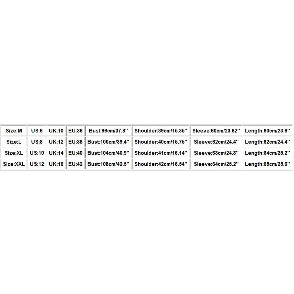 | Размеры: XL | Свяжитесь с нами: 10 | UK:14 | ЕС: 40 | Обхват груди: 104 см/40,9 дюйма | Ширина плеч: 41 см, 16,14 дюйма | Рукав: 63 см/24,8 дюйма | Длина: 64 см/25,2 дюйма |