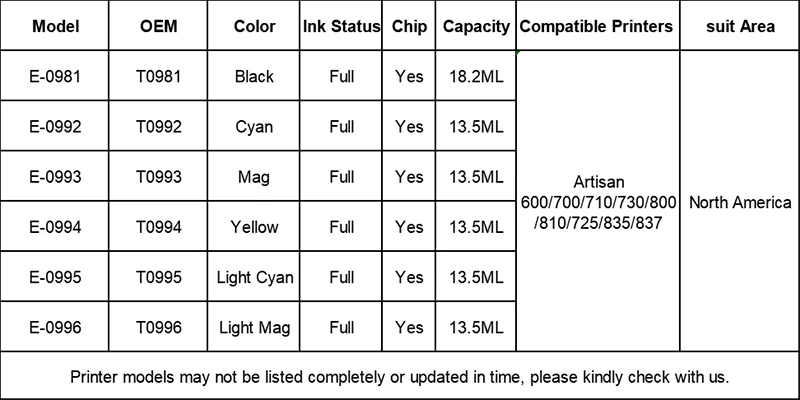 T0981 T0992-T0996Compatible чернильный картридж комплектация: 1 шт. T0981 черный 1 шт. T0992 голубой 1 шт. T0993 Mag 1 шт. T0994 желтого цвета 1 шт. T0995 светло-голубой 1 шт. T0996 Light Mag Преимущество: 1. Чернила: чистый цвет, почти такой же, как оригинал, трудно выцветает и хорошо сохраняет ваши файлы. 2. Чип: 100% совместим. 3. Yield page достаточный объем чернил убедитесь, что страница yield совпадает с оригинальной. 4. Простота в эксплуатации: Наши чернильные картриджи включены инструкции и очень легко установить.