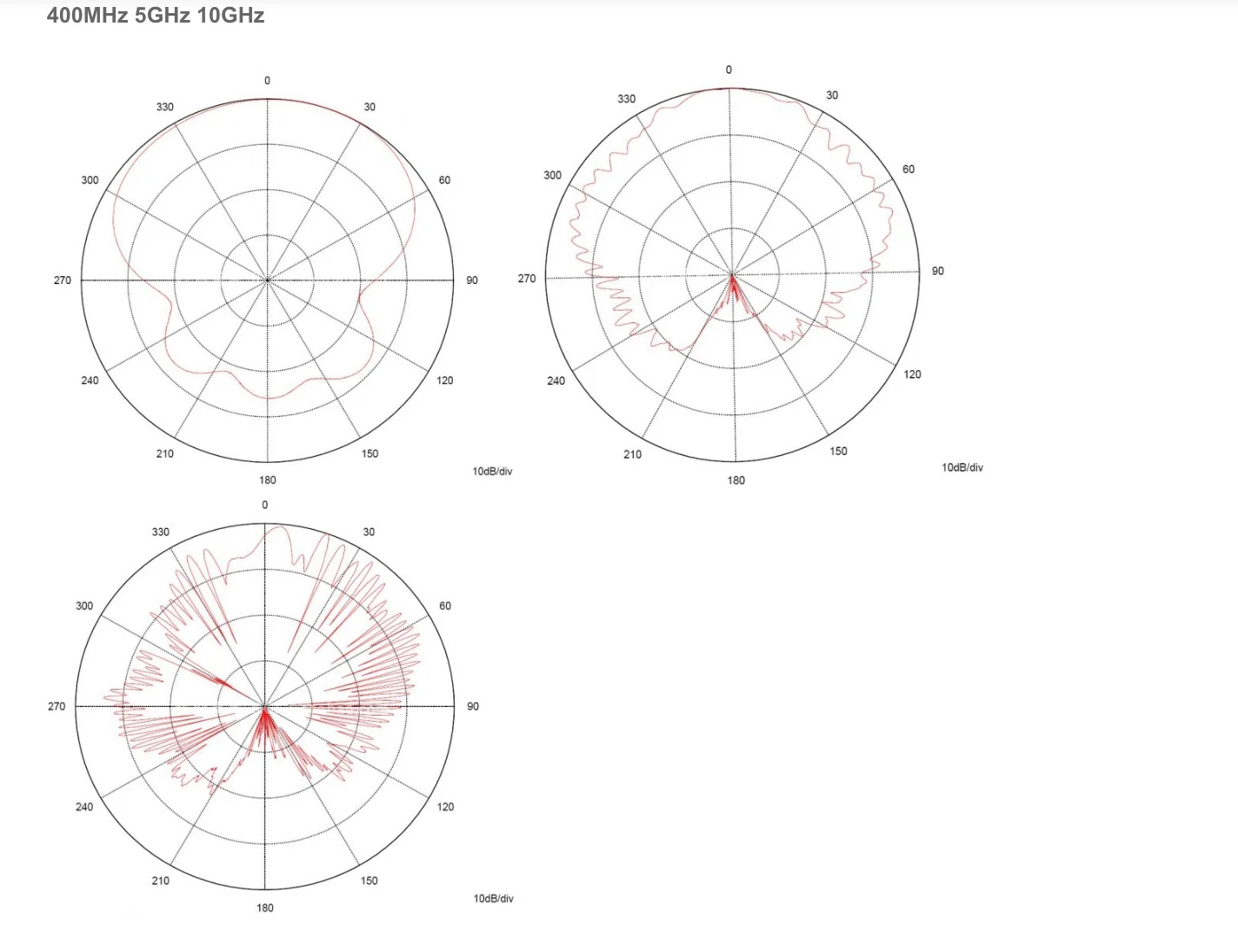 Ниже 3 ГГц, типичное значение усиления R100B составляет 5dBi, что выше на низких частотах и до 7.6dbi на самом высоком (около 800 МГц). по мере приближения частоты 3 ГГц, усиление медленно опускается до 2dBi.