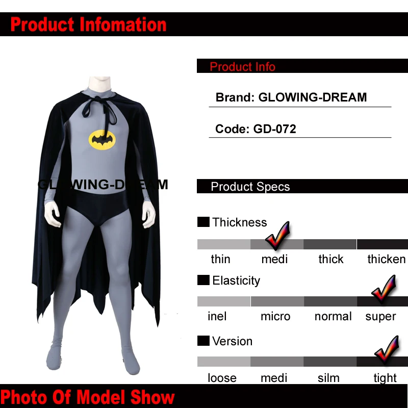 Материал:Лайкра Характеристики:Бэтмен В наличии:Недоступна Срок обработки заказа:10-20Дней Моя детали:Необходимо ручная стирка, необходимо сушить в подвешенном состоянии, без порошка мыла, без сухой машины.В том случае, если вы хотитеИзготовление под заказ; Размер, Пожалуйста, выберите"Один размер"Когда вы размещаете заказ, и отправляете продавцу измерения тела,Рост, вес, ширина плеч, бюст, талия, бедра, длина руки и размер обуви