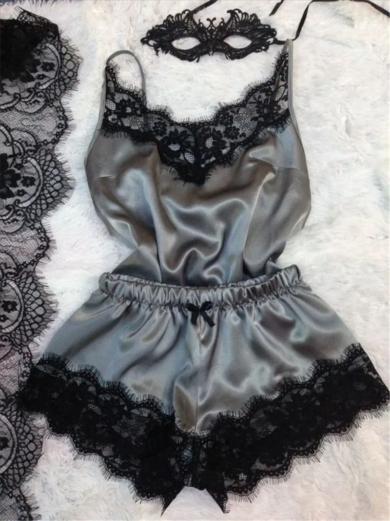 Hot Sale Womens Sexy Lingerie Sleepwear Satin Silk Pajama Sets Sleeveless V-neck Tank Shorts Babydoll Lace Nightwear Pajamas Set