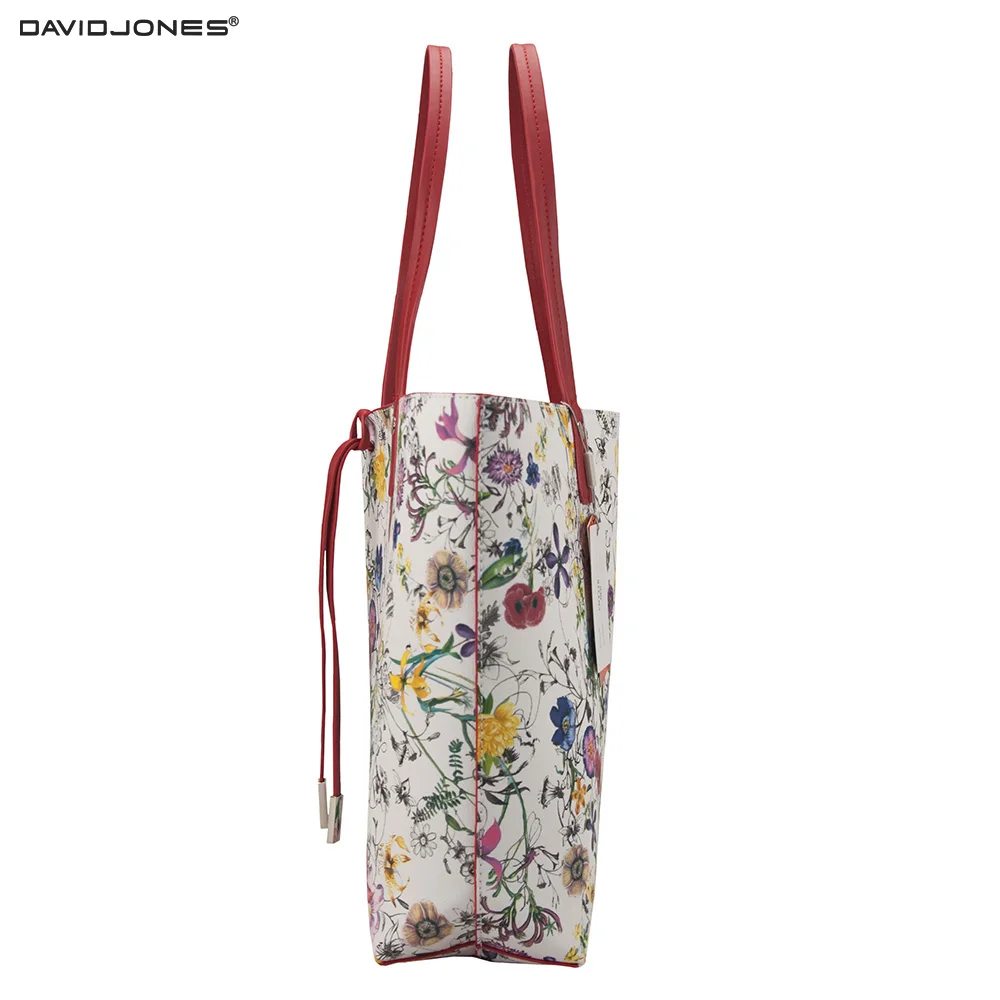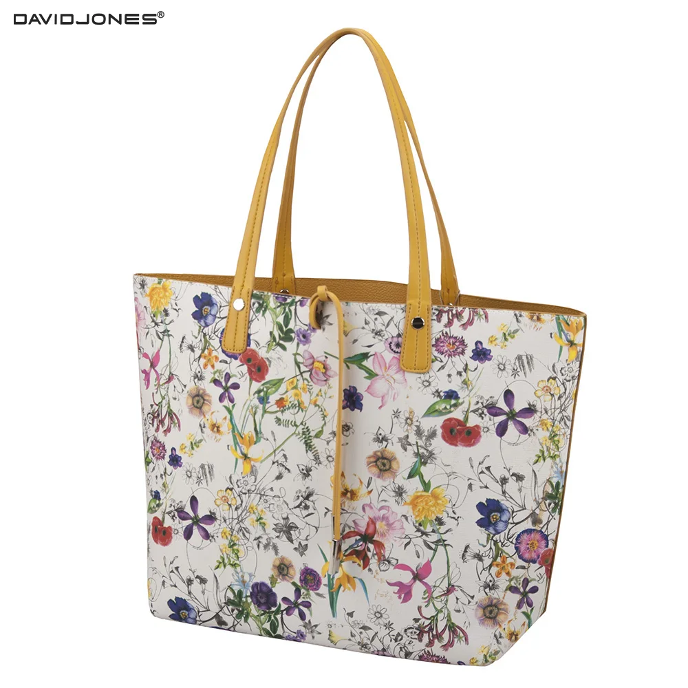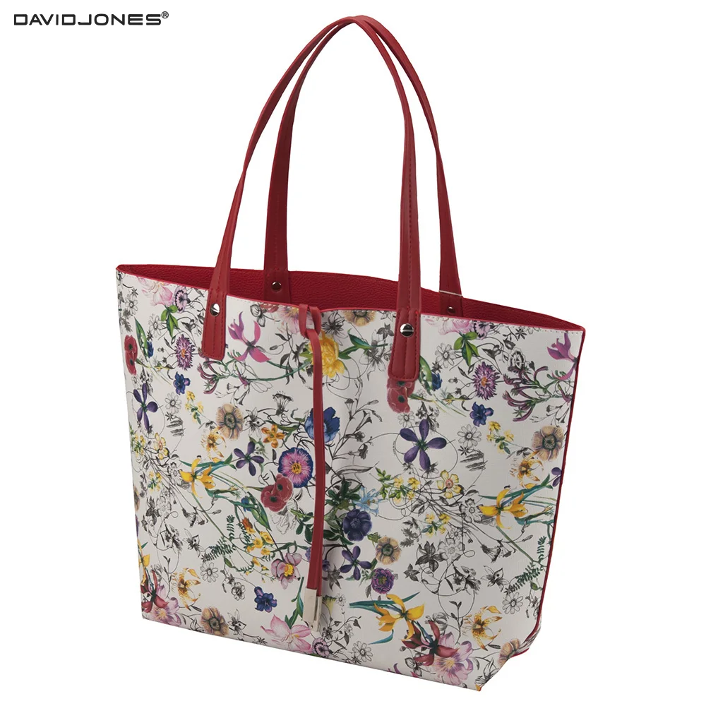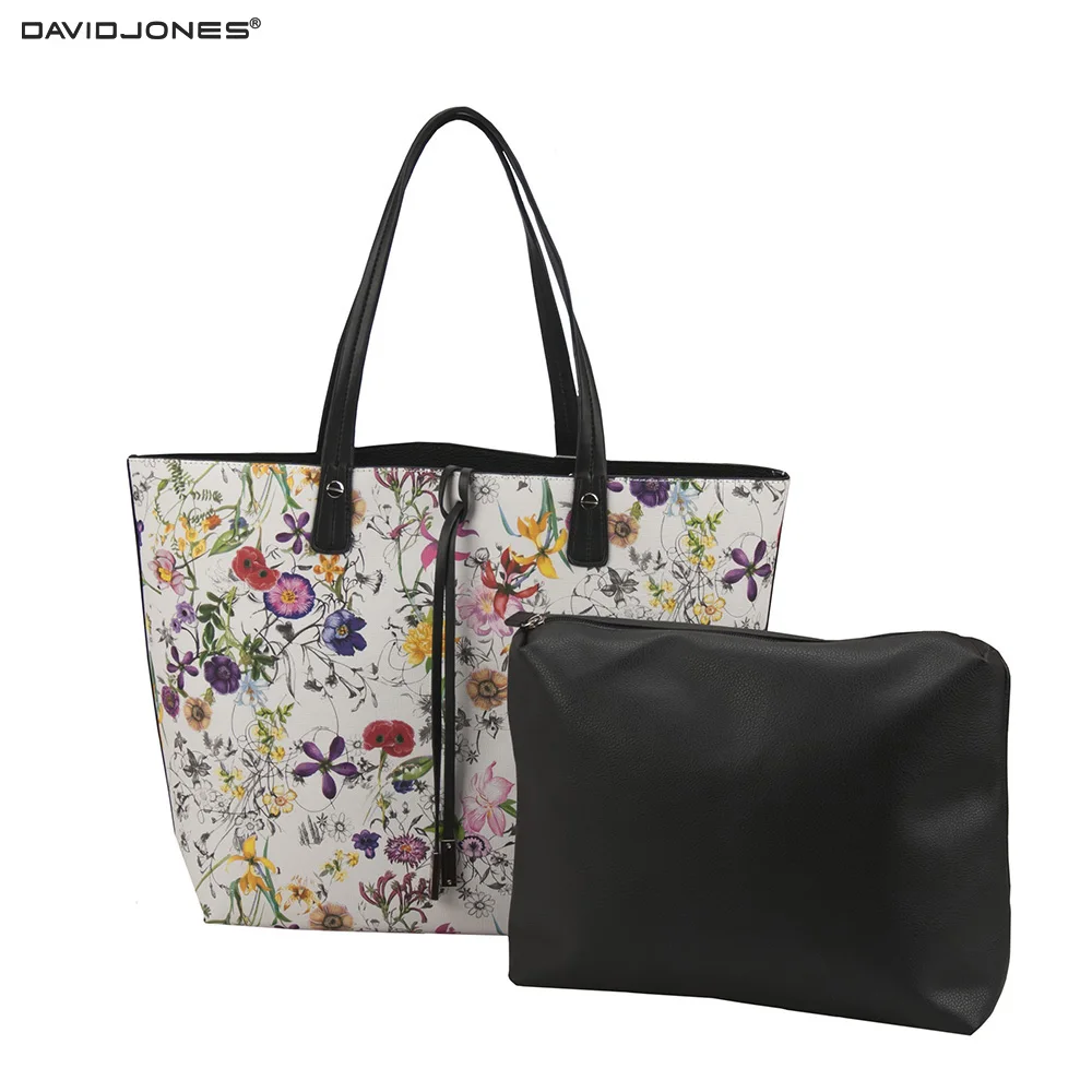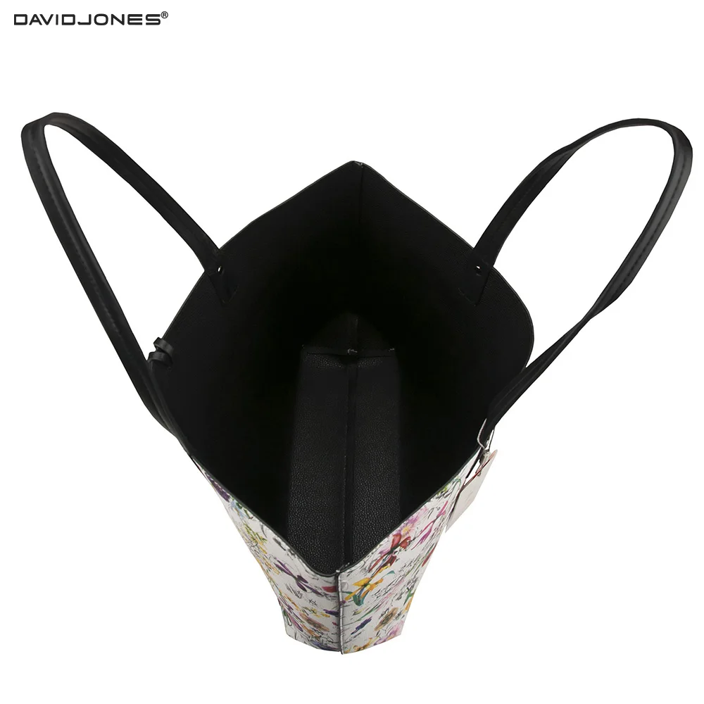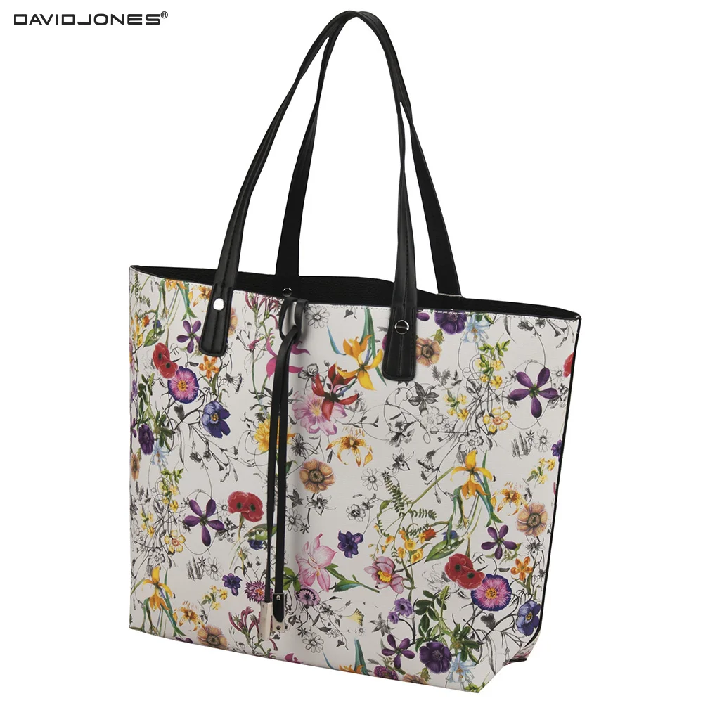 Женская сумка David Jones выполнена из качественной экокожи. В комплекте: большая сумка с двумя ручками и косметичка. Большая сумка, оформленная ярким цветочным принтом содержит одно вместительное отделение и не имеет застежек. Лицевая часть декорирована шнурком-подвеской из экокожи. Сумка не содержит дополнительных карманов. Внутренняя сторона выполнена из однотонной экокожи. Косметичка содержит одно отделение и застегивается на молнию. Внутри отделения - один открытый накладной карман и один врезной. Косметичка легко помещается в большую сумку.