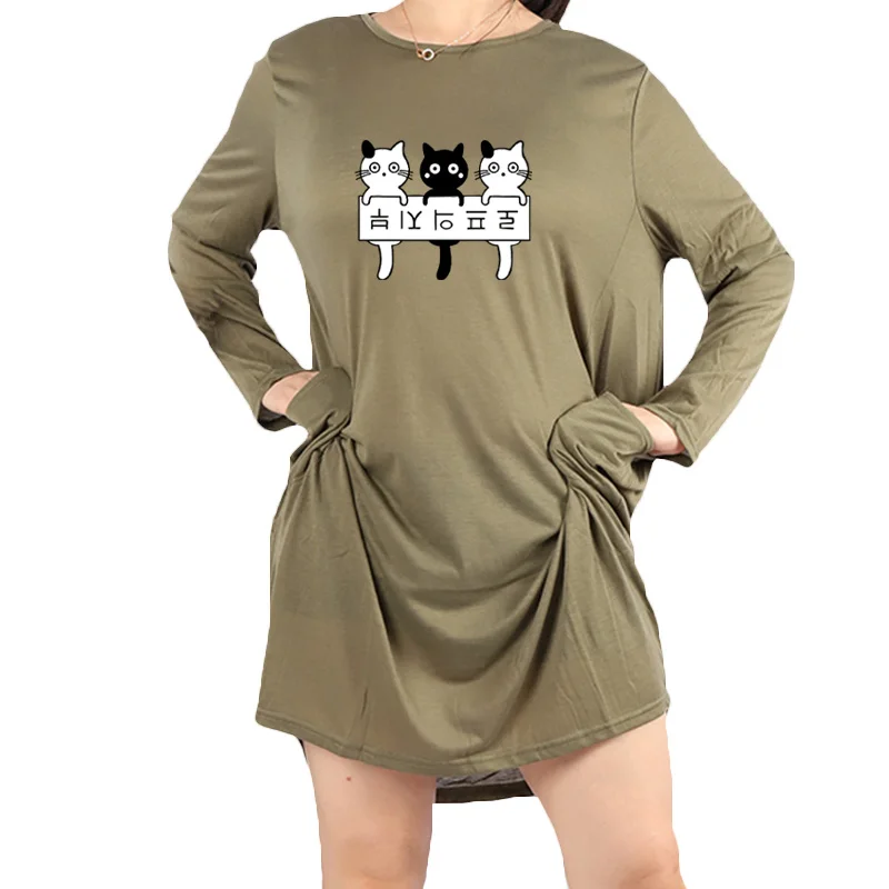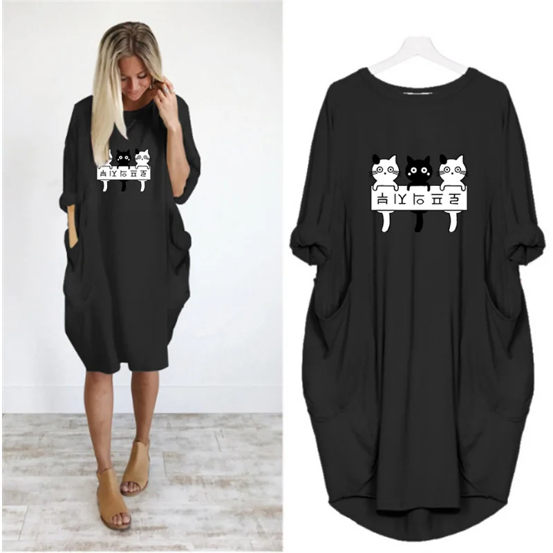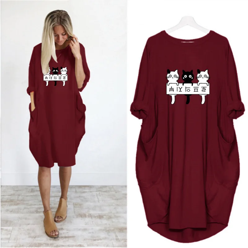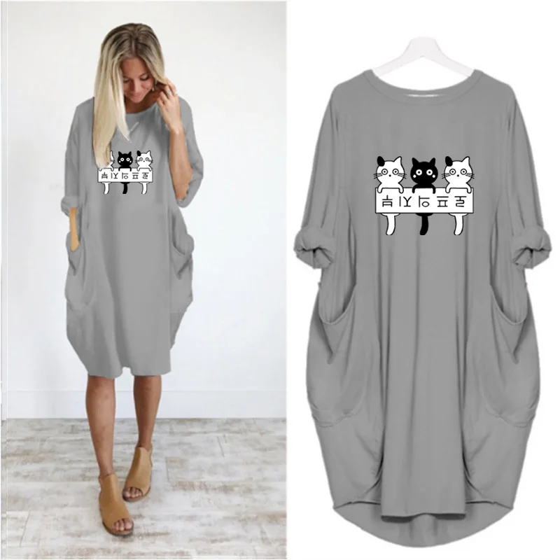 Платье с милым принтом кота, свободное платье с карманом, винтажная осенняя одежда макси, женские повседневные платья, вечерние женские платья размера плюс, Новинка