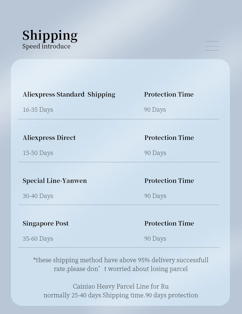 Ответ: Дорогой друг, мы отправляем его стандартным способом доставки, скорость доставки быстрее, чем экономичный способ доставки. Ниже есть фотография для введения времени доставки, вы можете проверить его.