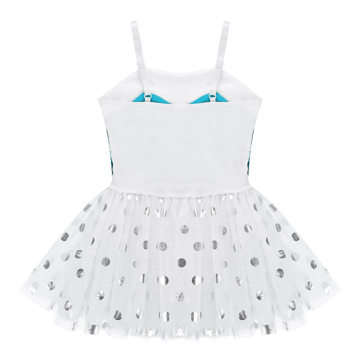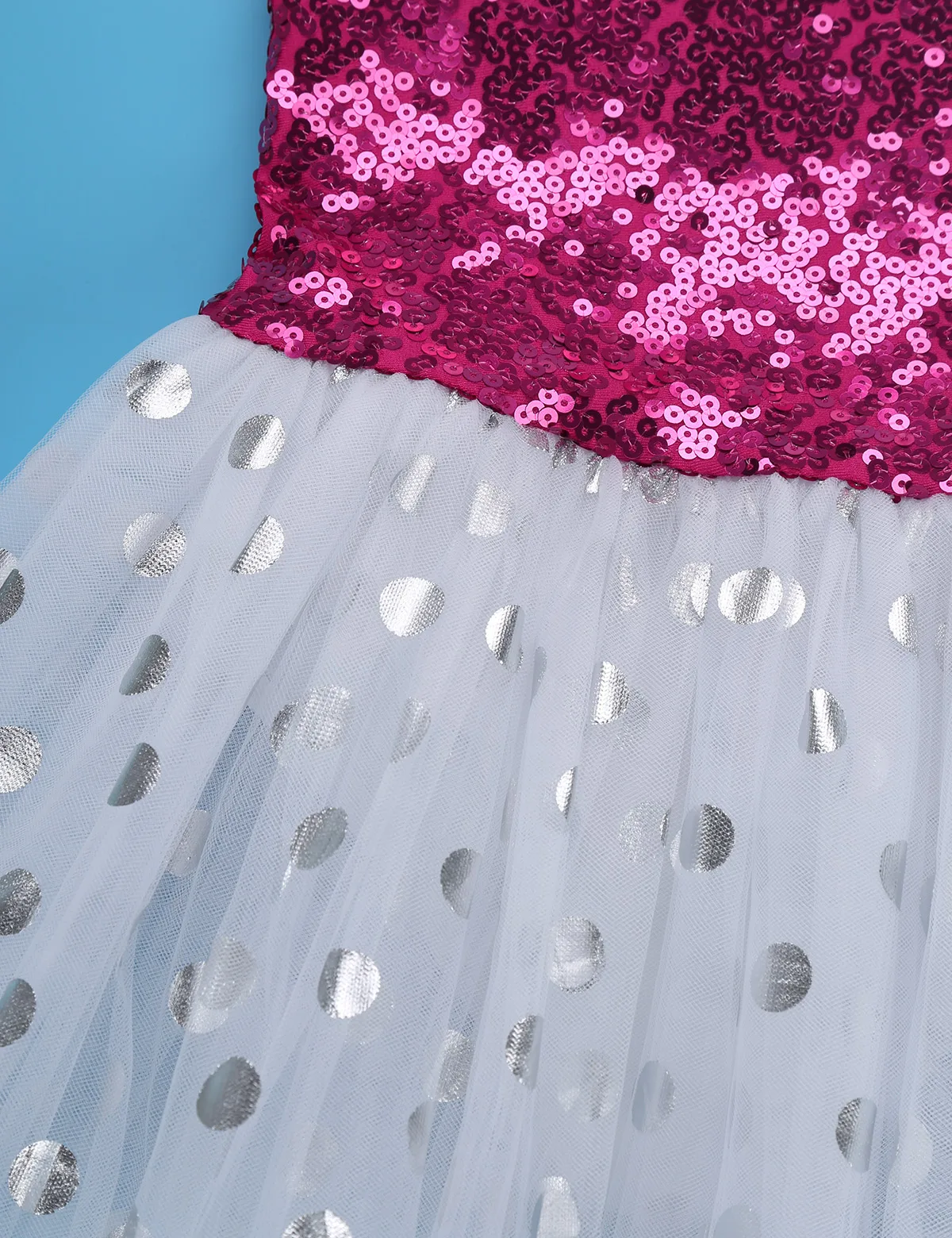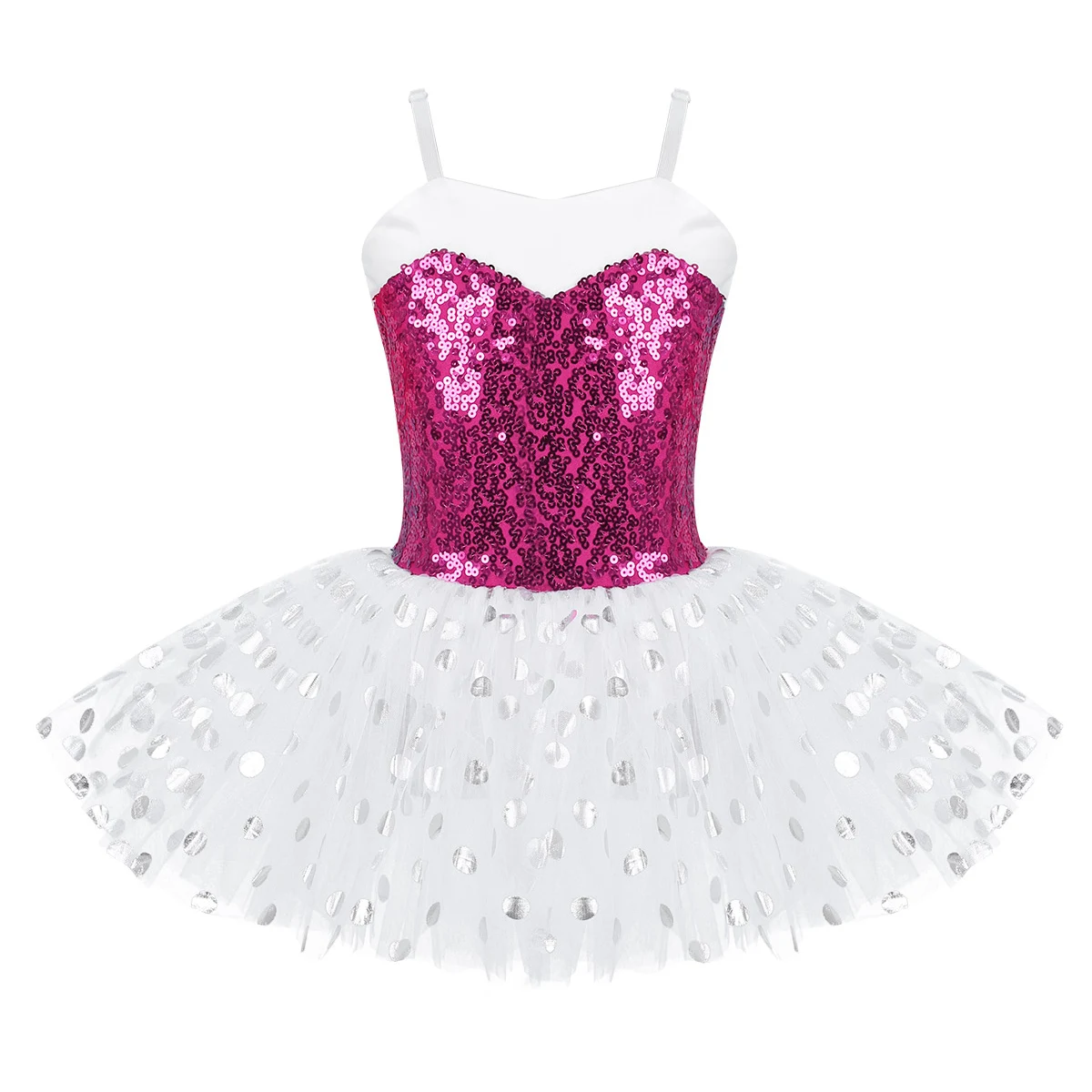 3-Слойная Юбка из сетчатой ткани крепится вокруг талии. Верхний сетчатый слой, украшенный принтом в горошек из фольги. Красивая танцевальная одежда для вашей девочки.