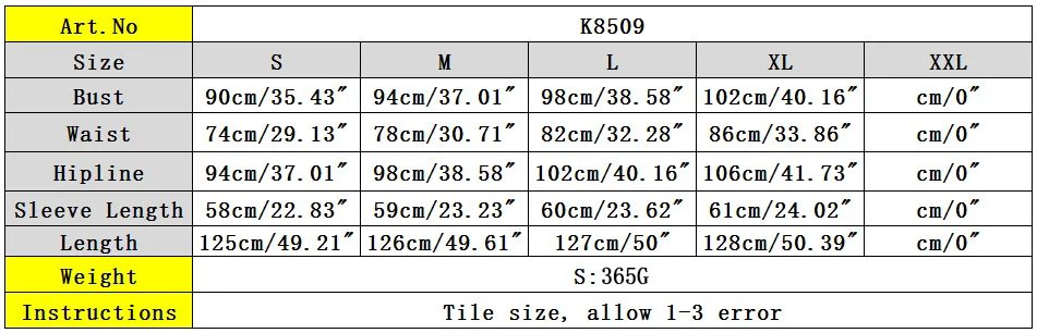 Размер S: обхват груди 90 см/35,4 дюйма, обхват бедер 94 см/37,0 дюйма, обхват талии 74 см/29,1 дюйма, рукав 58 см/22,8 дюйма, длина 125 см/49,2 дюйма; Размер M: обхват груди 94 см/37,0 дюйма, обхват бедер 98 см/38,6 дюйма, обхват талии 78 см/30,7 дюйма, рукав 59 см/23,2 дюйма, длина 126 см/49,6 дюйма; Размер L: обхват груди 98 см/38,6 дюйма, обхват бедер 102 см/40,2 дюйма, обхват талии 82 см/32,3 дюйма, рукав 60 см/23,6 дюйма, длина 127 см/50,0 дюйма; Размер XL: обхват груди 102 см/40,2 дюйма, обхват бедер 106 см/41,7 дюйма, обхват талии 86 см/33,9 дюйма, рукав 61 см/24,0 дюйма, длина 128 см/50,4 дюйма; О Размеры: 1. Азиатские размеры на 1-2 размера меньше, чем европейские и американские. 2. Пожалуйста, внимательно проверьте таблицу размеров перед покупкой товара, если вы не знаете, как выбрать размер, пожалуйста, свяжитесь с нашей службой поддержки клиентов. 3. Возможны отклонения в 2-3 см из-за ручного измерения. (1 см = 0,39 дюйма, 1 дюйм = 2,54 см) 4. Выберите больший размер, если ваш размер между двумя размерами.