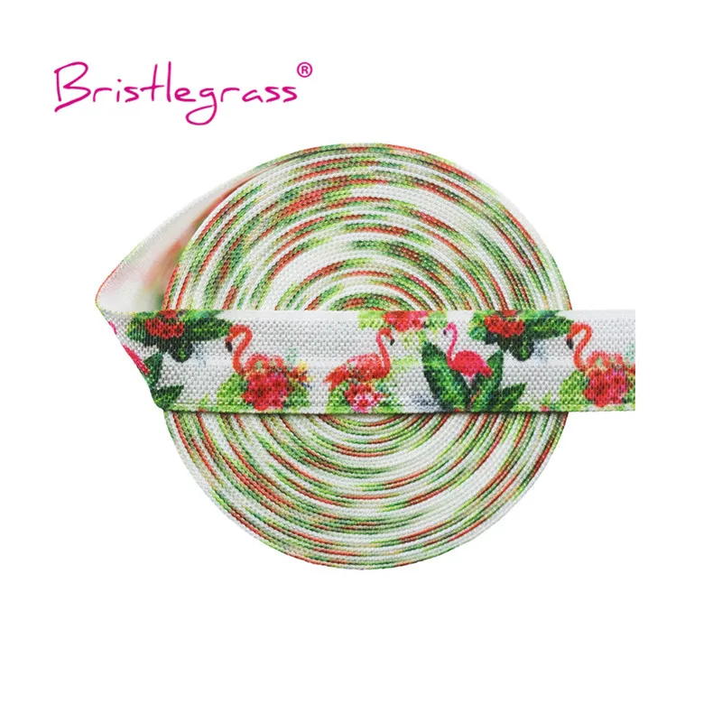 BRISTLEGRASS 5 Yard 5/8" 15mm Flamingo Flower Palm Leaf Print Foldover Elastic FOE Spandex Satin Band Headband Dress Sewing Trim