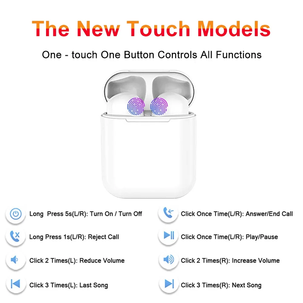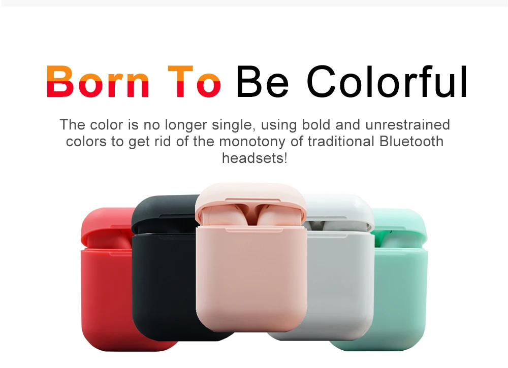 Модель: i12 Версия Bluetooth: 5,0 Цвет: (белый, черный, красный, синий, серый, розовый) Конфигурация: высокая с настоящей медной кольцевой динамик Батарея: 300AH + 30AH (чистый Кобальт) Звонок: 4-4,5 часов Прослушивание: 2,5-3 часа Функция: бинауральный вызов, Автоматическое Сопряжение, smart touch, поддержка с функцией Siri, низкое энергопотребление Продукты включают в себя 1 * одна пара bluetooth-гарнитур 1 * Подставка для зарядки 1 * кабель для зарядки 1 * Руководство пользователя