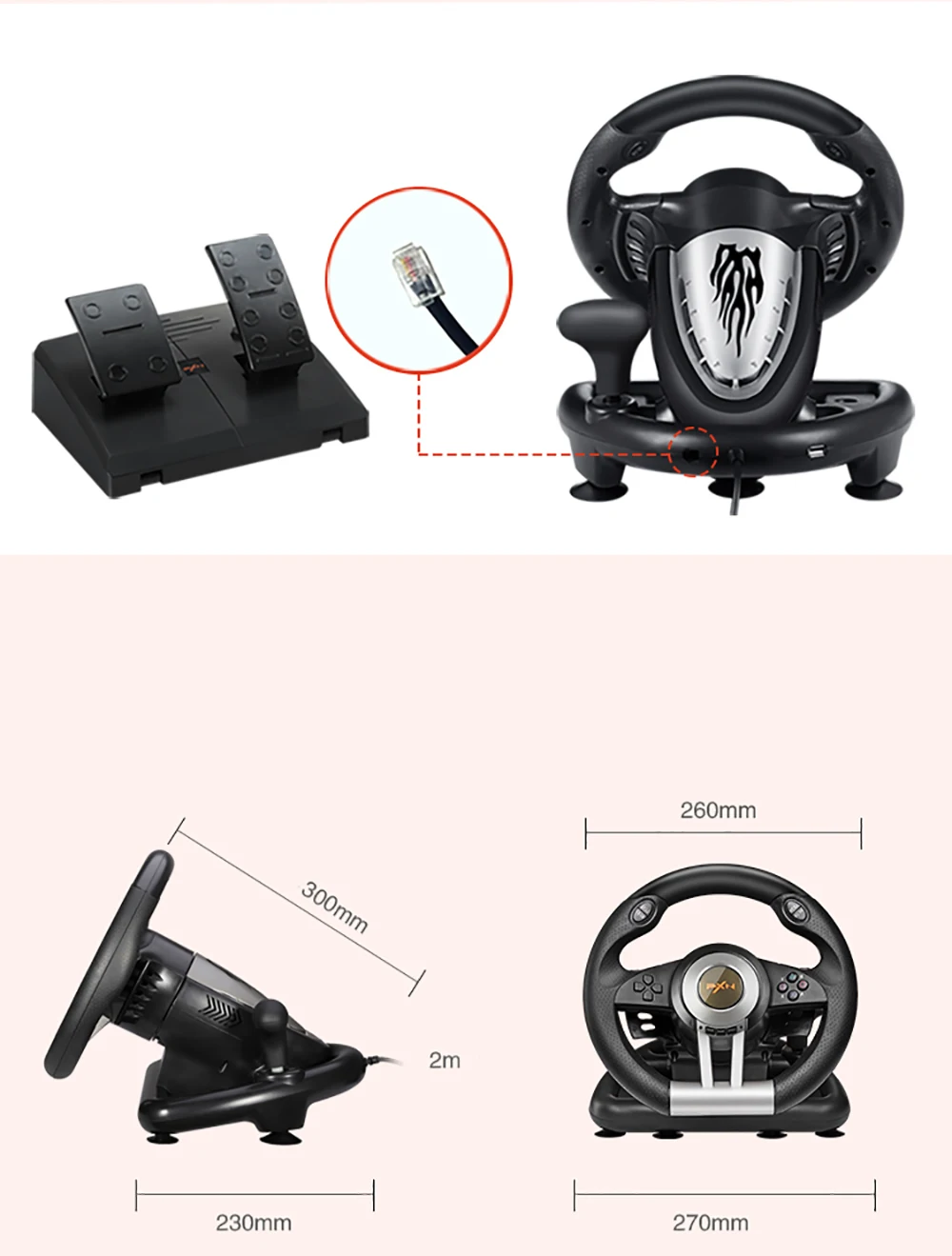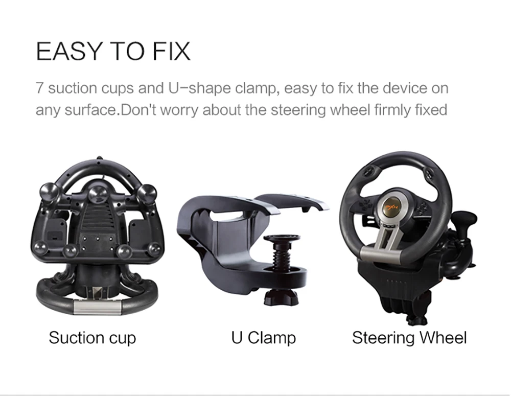 -Совместимость с ПК, PS3, PS4 и Xbox One, удовлетворяет ваши различные требования к играм -С 7 мощными присосками и u-образным кронштейном, удобно фиксировать и играть -Руль на 180 градусов, легко управлять -Складная игровая педаль с пружинным и тормозным управлением -Встроенный двойной вибрации двигатели, дать вам больше реального опыта игры -Высокоточный поворотный потенциометр, автоматически возвращается в исходное положение -Интеллектуальная функция круиза, отпустите ноги и Наслаждайтесь игрой вождения -Все-в-одном форма внешний вид, модный и лаконичный