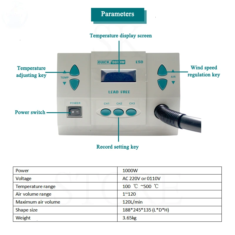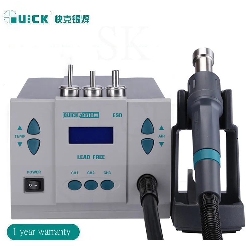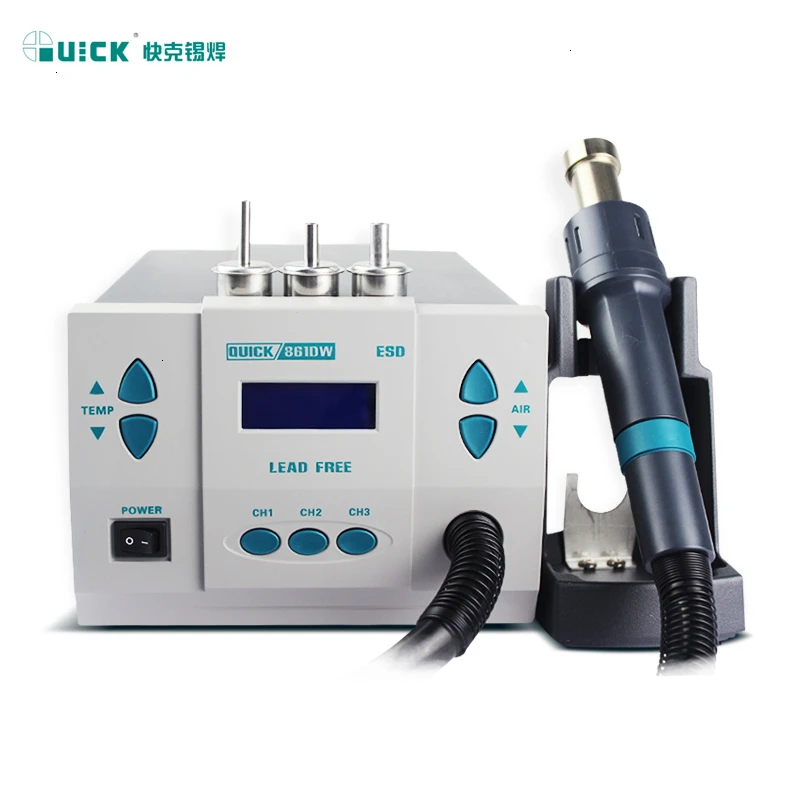 Оригинальная 1000 Вт быстрая 861DW Тепловая пушка без свинца, паяльная станция с микрокомпьютером, температура горячего воздуха, паяльная станция с 7 насадкамиСпециальный Особенности1. Имеет три рабочих Канала CH1, CH2, CH3, и каждый канал может быть установлен на количество ветра и температуры.2. С защитой паролем и функцией блокировки ключей.3. Чтобы облегчить работу в режиме реального времени, с магнитным рычагом управления переключателем помещается в держатель ручки немедленно в спящий режим.4. С автоматической функцией сна, в спящем состоянии могут быть установлены параметры.5. Сенсорная замкнутая петля, микрокомпьютер с нулевым пусковым механизмом контроля температуры, питания, нагрева быстро, легко и точно отрегулировать температуру стабильно, без влияния ветра.6. Вихревые бесщеточные вентиляторы, регулируемый поток воздуха, широкий диапазон, могут быть адаптированы к различным видам использования.7. Система имеет функцию автоматического охлаждения ветровой мощности, продлевает срок службы нагревательного элемента и защищает ручку горячего воздуха.ДетальМощность 1000WНапряжение AC 220V/110VДиапазон температур 100 ~ 500Диапазон объема воздуха 1 ~ 120Максимальный поток воздуха 120 л/минРазмеры 188 (L) раз 245 (D) раз 135 (H) ммВес около 3,65 кгПосылка