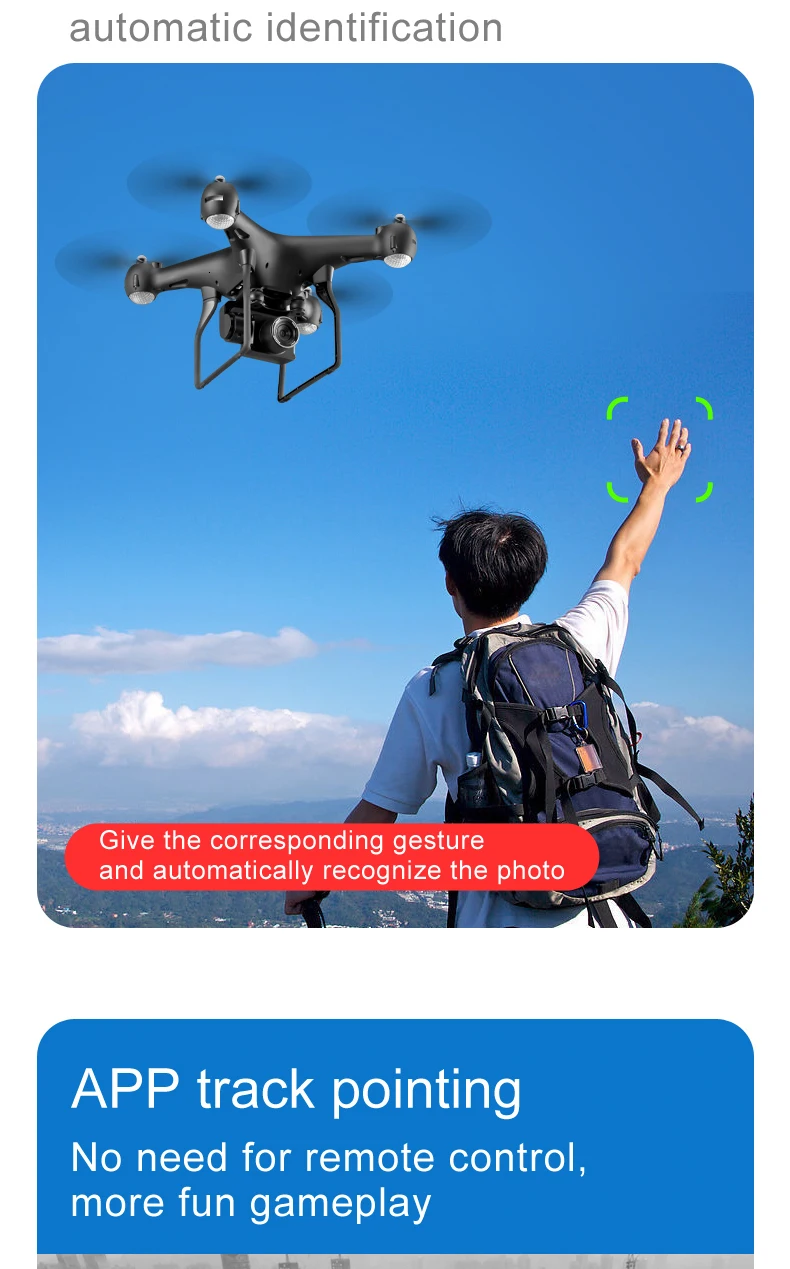 Функция: вверх/вниз, вперед/назад, поворот влево/вправо, боковой полет, светодиодный свет, Безголовый режим, один ключ автоматического возврата, отслеживание полета, режим удержания высоты, фото жестов, жест видео