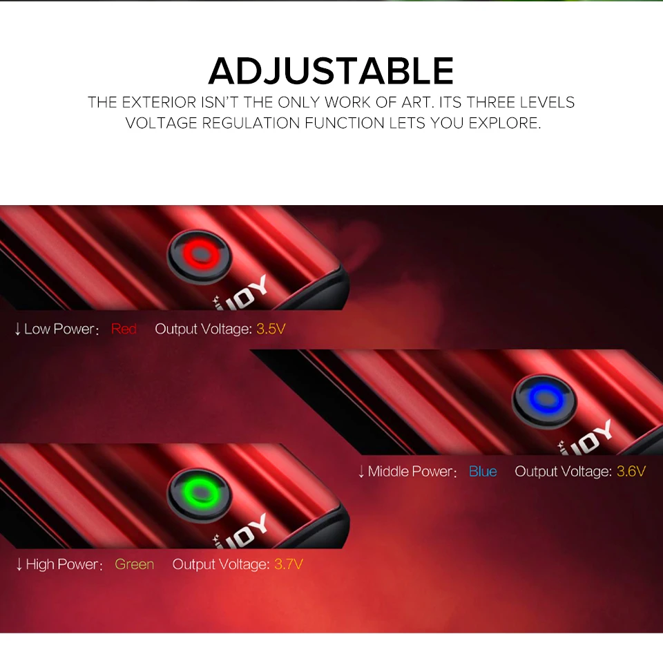 1. Изготовленный дизайн, гармоничная форма и роскошный стиль 2. Катушка 1,2 Ω совместима с солями e-juice и nic 3. Три выходных напряжения: 3,5 в, 3,6 В, 3,7 в 4. Аккумулятор 650 мАч, максимальный выход 12 Вт 5. Светильник и тонкое шасси, везде, где вы делаете 6. Светодиодный индикатор, показывающий различные условия работы