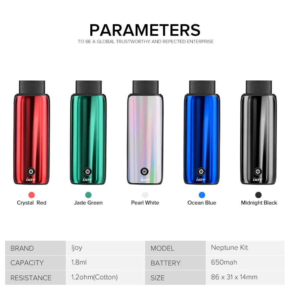 Ijoy комплект Neptune поставляется со встроенным аккумулятором емкостью 650 мА · ч, который безопасно и быстро заряжается, сохраняя при этом свою мощность намного дольше, с максимальным выходом 12 Вт, чтобы быть в состоянии к лучшему. Также он оснащен тремя переменными напряжениями (3,5 в, 3,6 В, 3,7 в). Кроме того, он визуально покрывает изготовленный дизайн, гармоничную форму и роскошный стиль внешнего. Картридж Neptune оснащен емкостью для электронных соков объемом 1,8 мл и верхней системой наполнения. Небывалый опыт vaping с отличным вкусом!