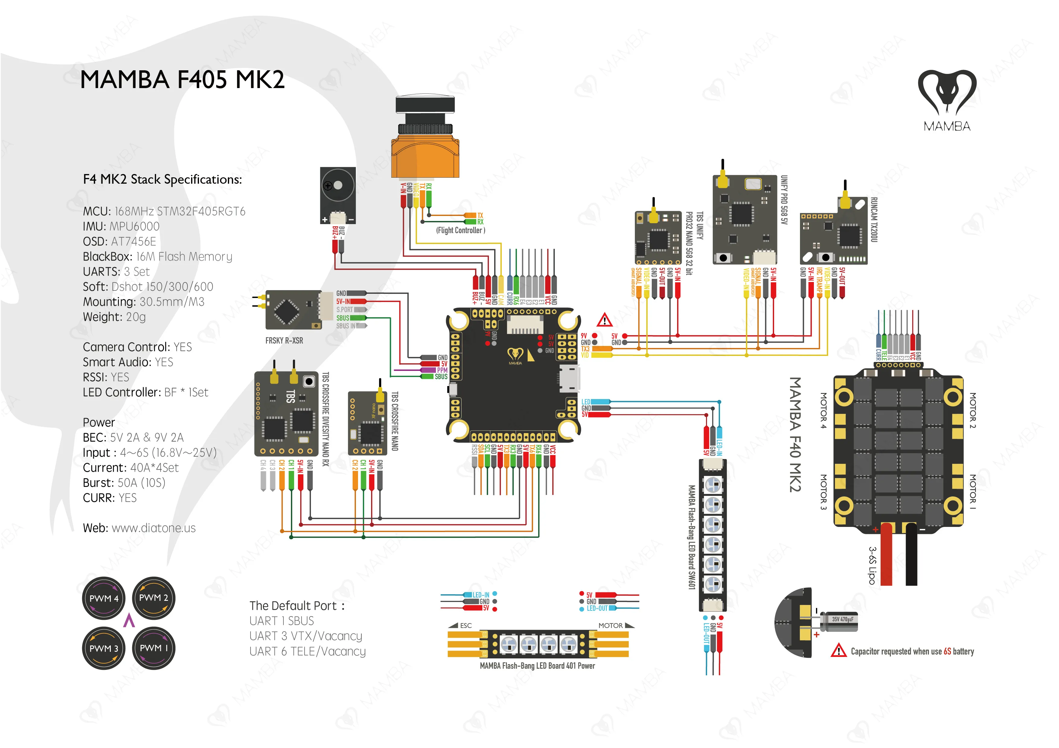 MAMBA F405 MK2 Контроллер полета и F40 40A 3-6 S DSHOT600 бесщеточный ESC для RC моделей запчасть для мультикоптера аксессуары Спесификайтон: Mamba F405 для контроллера полета Название позиции: F405 Контроллер полета Betaflight Входная мощность: 10-28 в (3-6 S) BEC: 5 В/1.5A MCU: STM32F405 Гироскоп: MPU6000 Флэш-память: 16 MB Серверный компьютером с экранным меню: AT7456 Монтажное отверстие: 30,5*30,5 мм Вес: 6g Мамба F40 ESC Наименование товара: Mamba F40HV ESC Входное напряжение: 3-6 S (7,4 V ~ 24 V) По-прежнему ток: 40AA×4 Burst ток: 40/50A (6 S) BEC: нет Монтаж: 30 мм/m3 м3 Вес: 10 г Посылка включает в себя: 1 Контроллер полета Mamba F405 Betaflight 1 х Mamba F40 HV ESC