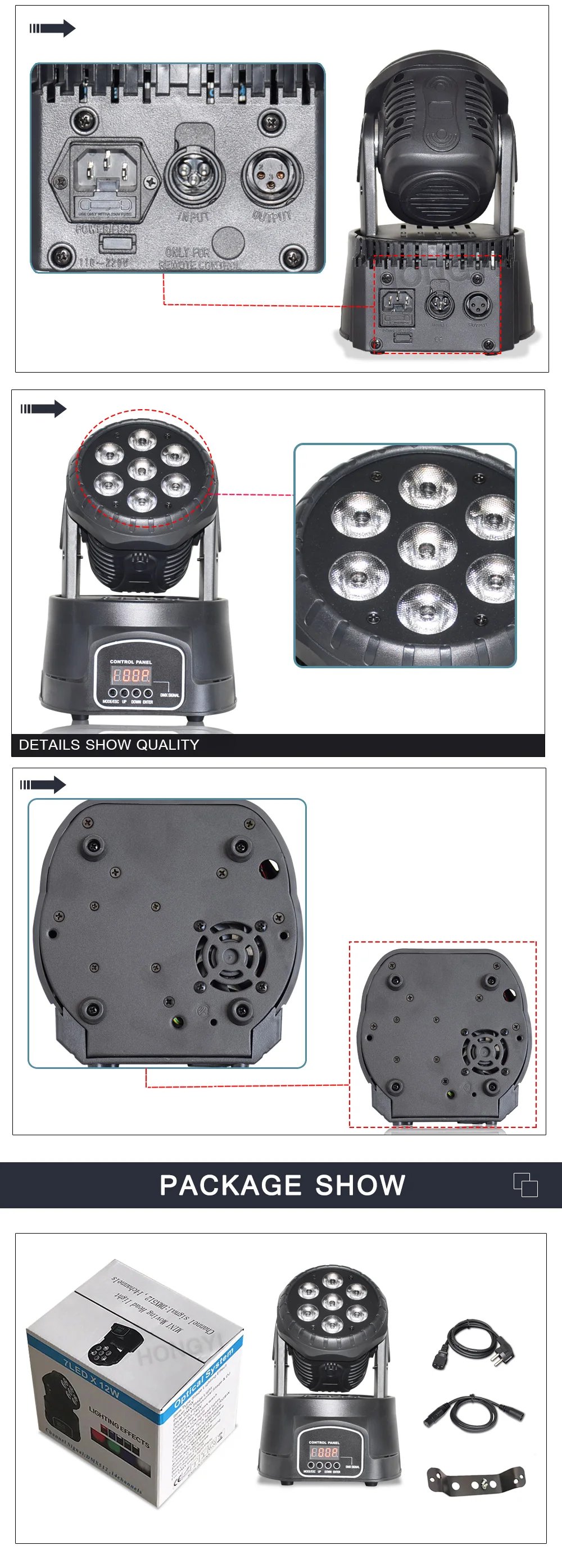Режим работы: DMX512, управление ведущим-ведомым, автоматическое, голосовое управление.