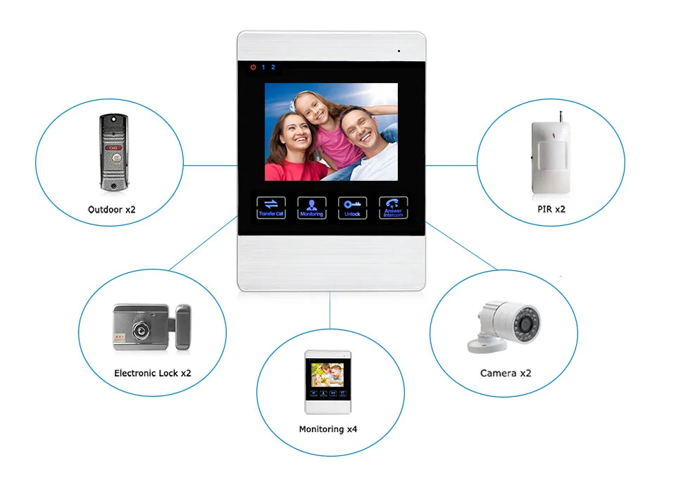 * Поддержка-2 панели вызова + 4 внутреннего монитора + 2 аналоговых камеры + 2 PIR