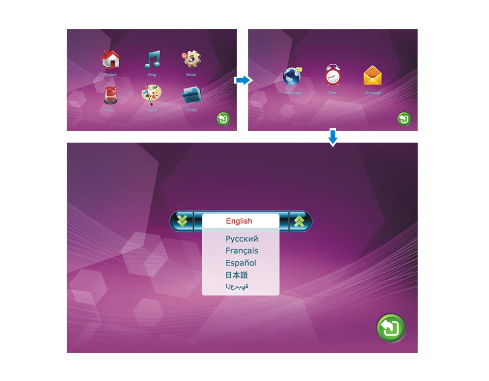 Система поддерживает шесть различных языков: английский, русский, французский, арабский, испанский, японский.