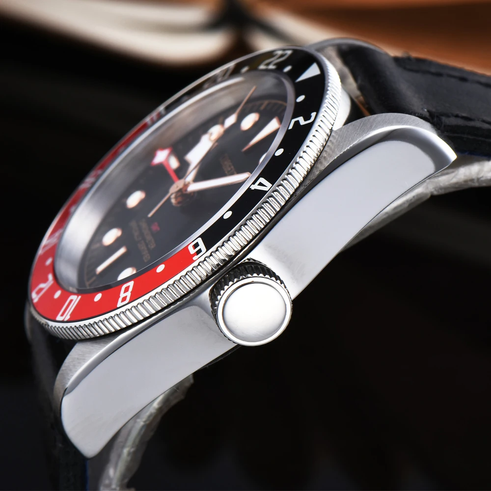 Описание продукта: Бренд: Debert Механизм: автоматический (самообмотка) механизм Часовой пояс: GMT Dual time zone Материал корпуса: полированный корпус из нержавеющей стали 316L Диаметр корпуса: 41 мм без короны Толщина: 12,5 мм Цвет циферблата: черный Рамка: Сплав Браслет: кожаный ремешок с пряжкой Тип застежки: раскладная пряжка Переднее стекло: сапфировое стекло Световой поток: зеленый