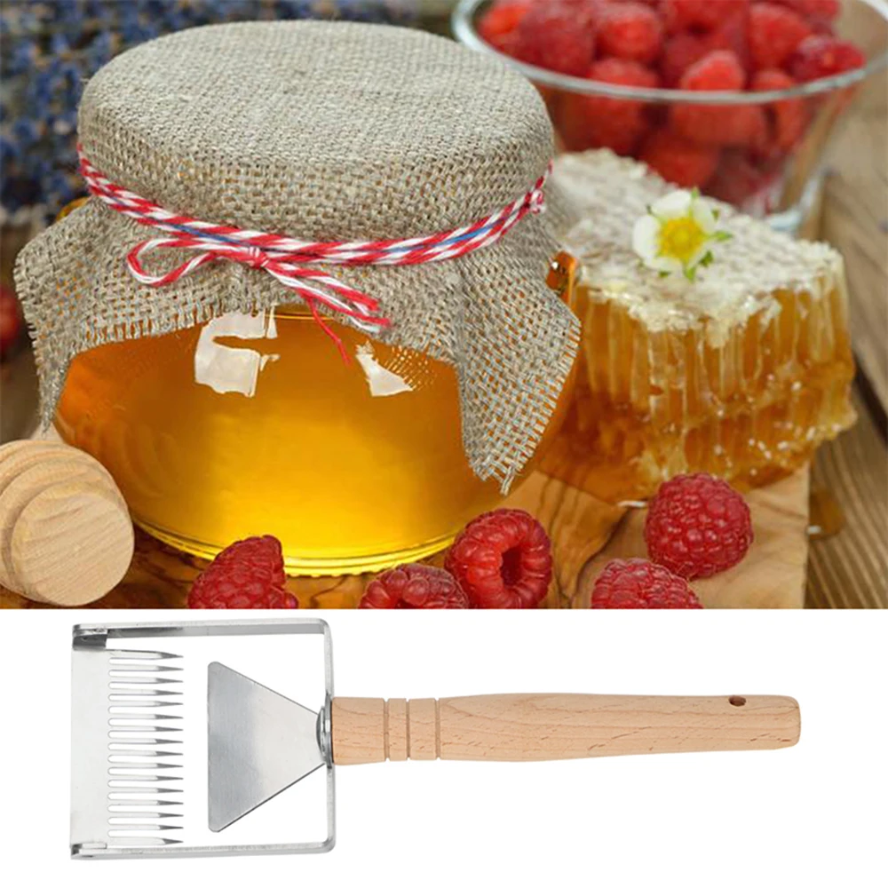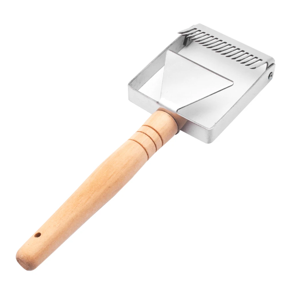 Медовый скраппер изготовлен из нержавеющих жестяных пластин и гладкой деревянной ручки.