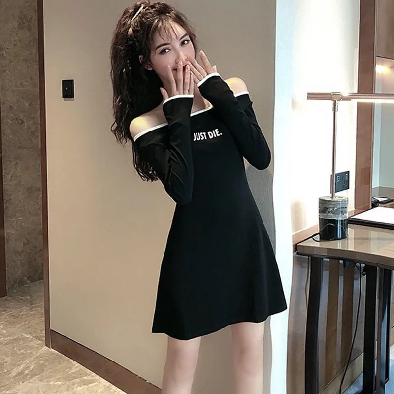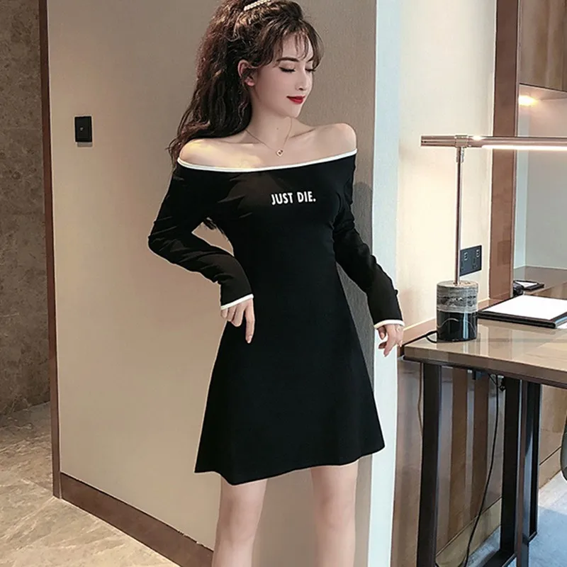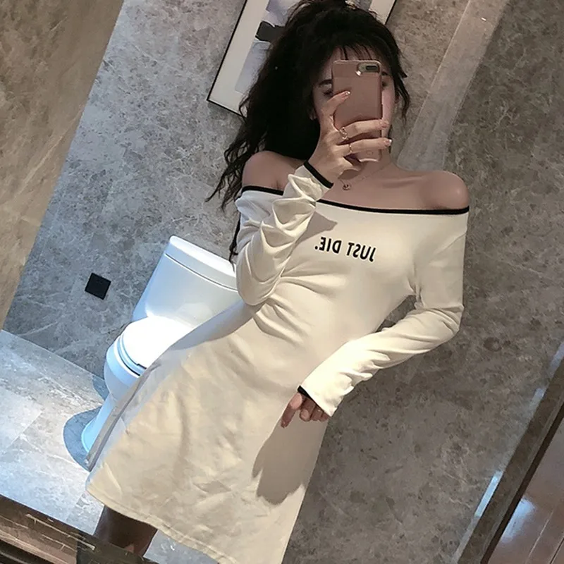Особенности: Корейская версия; Принт с буквами; Сексуальный; Вырез лодочкой; Длинные рукава; Платье с открытыми плечами