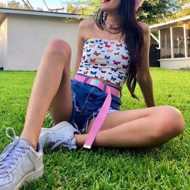 3. Короткий короткий пупок, цветной принт с бабочками, короткий открытый пупок, без плечевого ремня, удобный и дышащий, высокая эластичность, хорошая воздухопроницаемость.