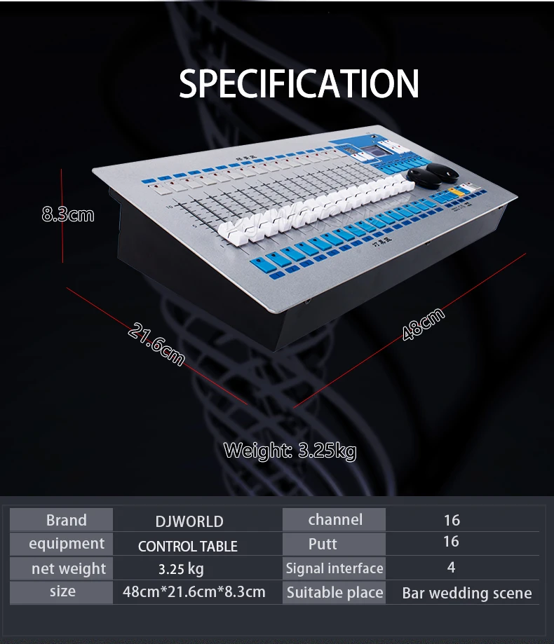 DMX канал: 1024 Шаг сцены: 600 Сцены для работы одновременно: 10 Графика для каждой сцены: 5 Приспособление: 96 шт. Графика может быть работать в одно и то же время Количество: 10 Фейдер сцен и Затемнение: Поддержка Наклон/наклон Swop: Да Выход обратного канала: Да Изменение наклона канала: Да Сцена и диммер с помощью слайдера: Да Сцена с кнопками управления: Да Размер продукта: 47,5x35x10 см Вес: 8,55 кг