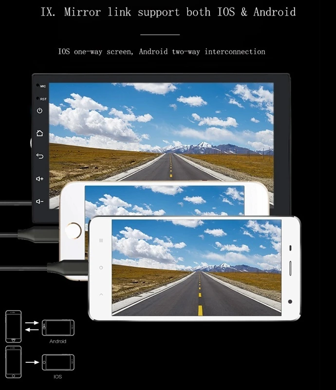 Зеркальная ссылка для смартфона (зеркальная ссылка): зеркало телефона на 7-дюймовом большом экране. Вы можете зеркало на устройстве через usb-кабель или подключение Wi-Fi для устройств Android. Для iPhone, вы можете только зеркало на устройстве через wifi
