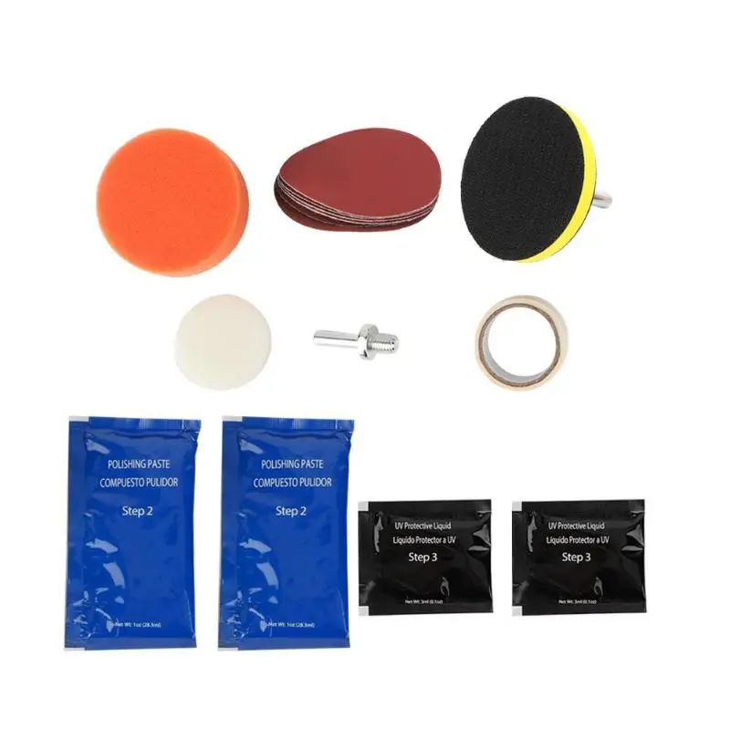 Описание: Этот комплект позволяет вашему блеск и восстановления пластиковые линзы, в том числе фары, задние фонари, противотуманные и направляющие огни. Восстановив четкость к объективу, производительность фар улучшается и внешний вид транспортного средства, улучшенное звучание. Теперь вы можете произвести профессиональные результаты с набором для восстановления линз фар. Комплект включает в себя все наборы, включая все предметы, необходимые для выполнения задачи, за исключением ленты для маскировки. Особенности: 1. Предназначен для восстановления четкости линз фар, которые стали желтыми, облачными или туманными. 2. Комплект для восстановления фар улучшает характеристики фар. 3. Три простых действия: песок, полировка и защита. 4. Легче, чем Замена старой фары 5. Поставляется с простой в использовании инструкцией. 6. Автомобильная фара, комплект для восстановления не включает бытовой полировальный станок. 7. Восстанавливает фары, задние фары, противотуманные фары или направления света. 8. Данный набор предназначен для того, чтобы восстановить 2 фары. Технические характеристики: Общий вес: 215 г Размер упаковки: 210*100*50 мм/8,27*3,94*1,97" Примечания: 1. Возможны незначительные отклонения в размере из-за ручного измерения, различных способа измерения и инструментов. 2. Изображение может не отображать фактический цвет товара из-за различного фотографического светильник, угол и монитор экрана. 2 X P1200 шлифовальные диски 2 X P2000 шлифовальные диски 1 х Оранжевый губчатый диск Паста для полировки 2X28,3 мл 2X3,0 мл Защитная жидкость 1 X лента для маски (300x2 см) 1 X задняя панель M10 Thread Адаптер (1 шт.) 1 х Белый губчатый диск