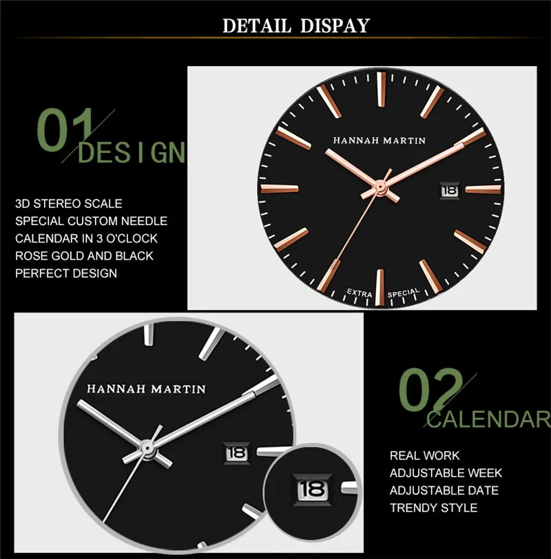 > Подробнее о продукте ●Brand --- HANNAH Martin ● Стиль часов ---------- модные и повседневные ● Механизм ---------- японский кварцевый механизм высокого качества ● Срок службы батареи ---------- более 3 лет ● Водонепроницаемый ----------- настоящий 30 м водонепроницаемый (вы можете плавать, дайвинг, мыть) ● Функция ---------- водонепроницаемый, календарь ●Drop доставка --- Поддержка > Параметр продукта ● Длина ремешка ---------- около 22 см ● Диаметр циферблата ---------- около 40,5 мм ● Толщина циферблата ---------- около 8 мм ● Ширина ремешка ---------- около 20 мм ● Вес ---------- около 102 г