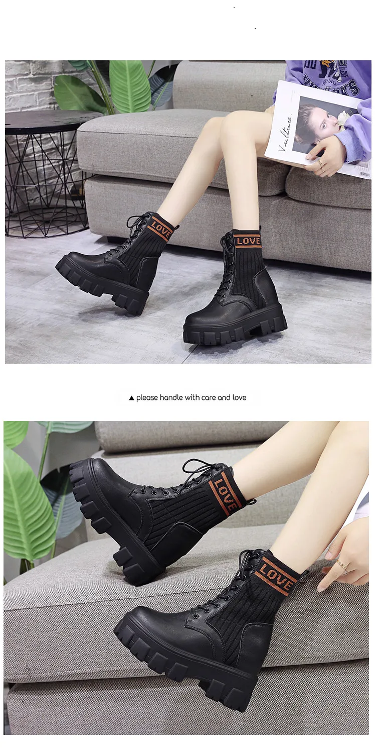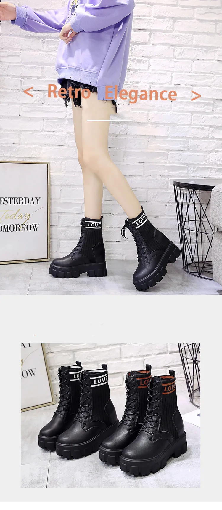Женские сапоги до середины икры, Модные осенние высокие кроссовки, удобные кожаные сапоги на платформе, зимние высокие сапоги на танкетке 9 см, 2019