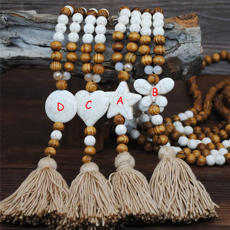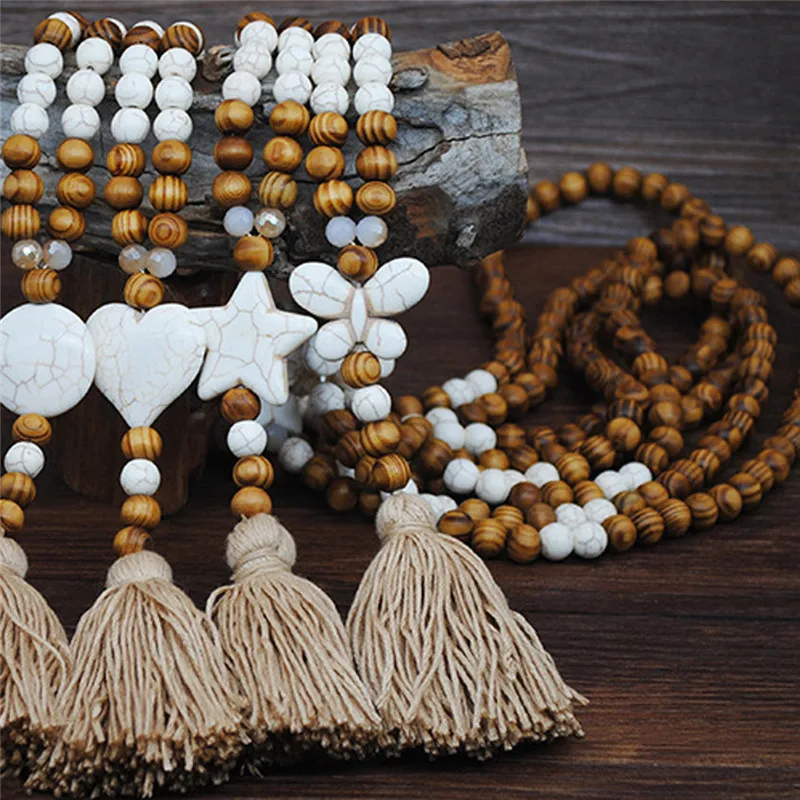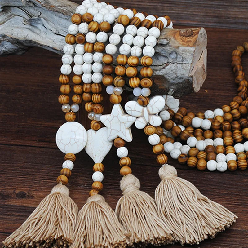 Богемное ювелирное изделие на цепочке, этническое ожерелье с кисточками и деревянными бусинами, подвеска в виде звезды, сердца, кофта-бабочка, длинное ожерелье для женщин