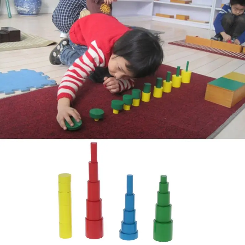 Деревянный материал Монтессори-Цилиндры Семейный комплект 4 комплекта баллонов разных цветов: красный, желтый, синий, зеленый