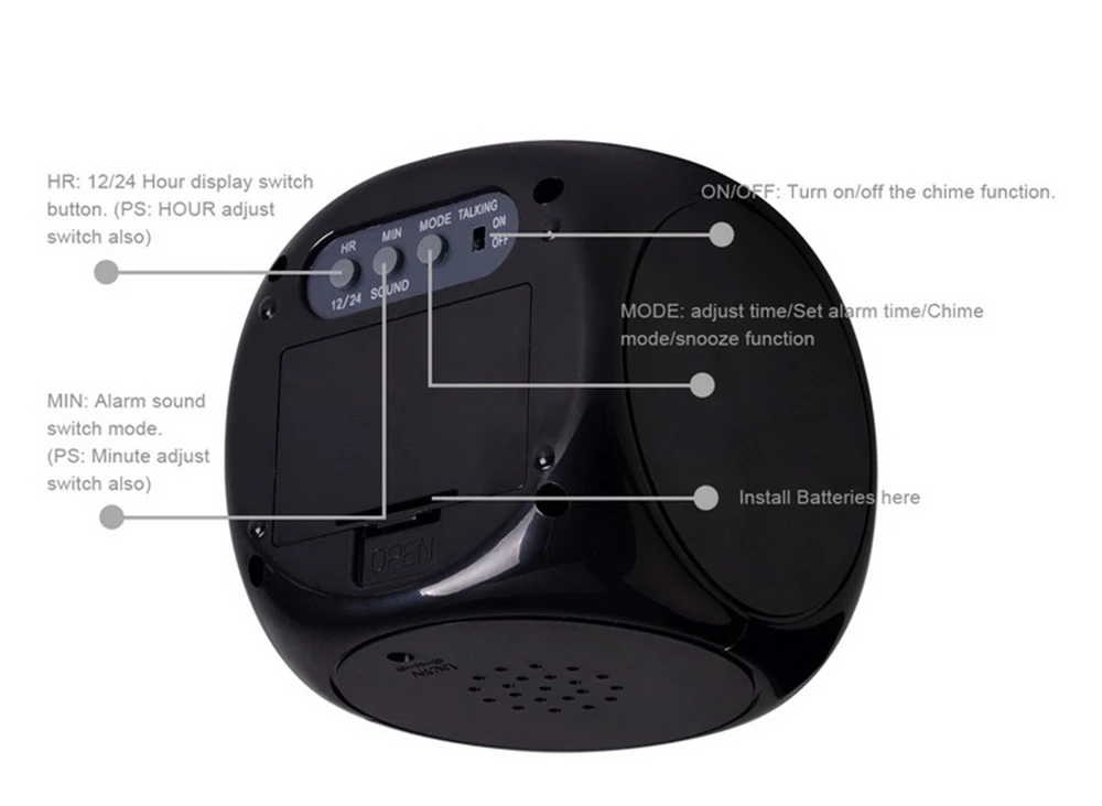 Функции 1. ЖК-дисплей 2. Сигнал тревоги и 10 минут повтора function3. Разговор: отчет о времени 4. Синяя подсветка I 5.CHIME1: каждый час; CHIME2: только с 7:00 до 9:00am6. Мульти будильник sounds7.Projection show time